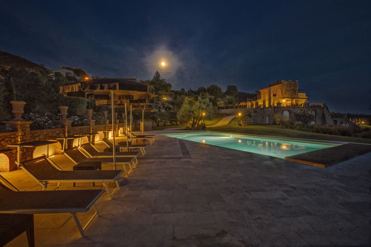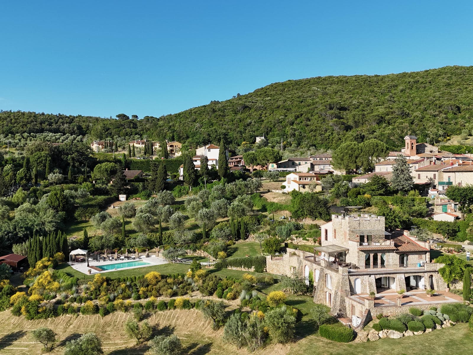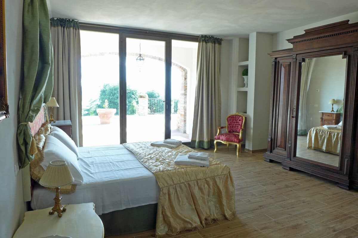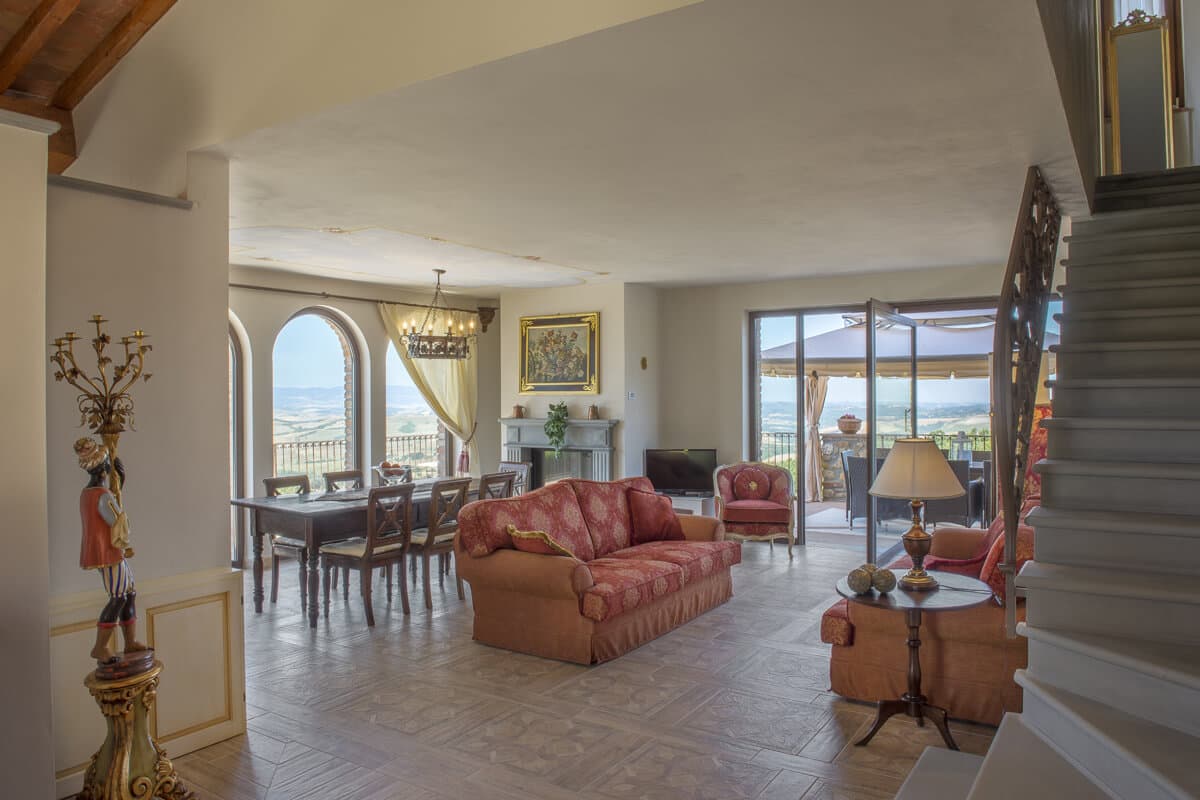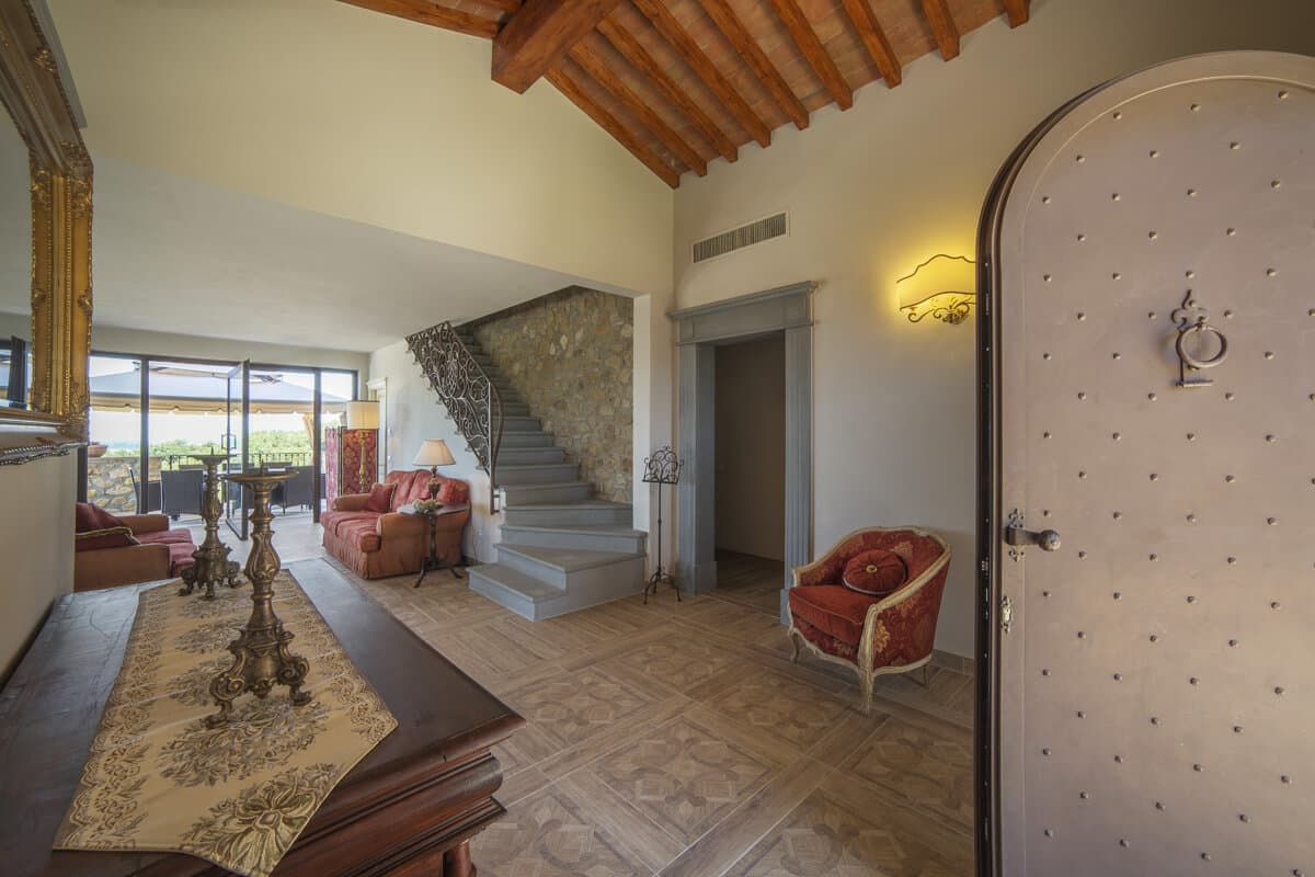 The owner has transformed this historic farmhouse on Iano's edge into an elegant retreat that's both sophisticated and thoroughly comfortable. Recent renovations added two generous ground-floor suites (one fully wheelchair accessible), bringing capacity to 12 guests across six bedrooms - each with its own ensuite bathroom and individual character. Air conditioning throughout means cool comfort even in August, while the open-plan living spaces connect seamlessly to that magnificent rear terrace through wide glass doors and arched windows.