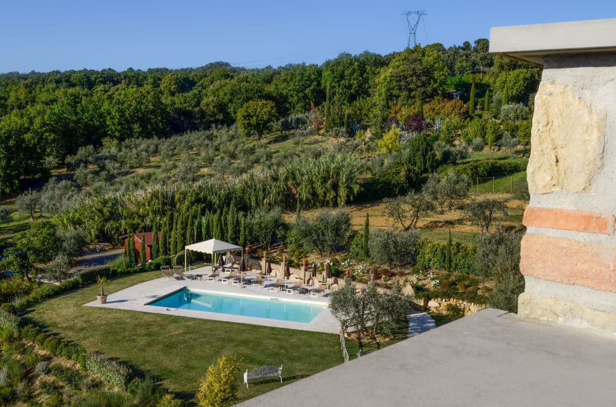 A wide terracotta walkway and gravel path lead from the terrace down past green lawns to the pool area where sun beds and umbrellas sit on a wide stone patio facing the Era river valley. While guests at Valdera overlook the pool of the neighbouring property, no one directly looks on to the back terrace or pool area of Valdera.