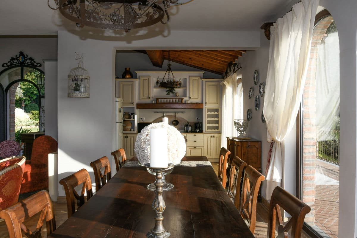 The entry hall flows into a living area with comfortable sofas and armchairs and an adjacent dining table for up to 12 in front of a large open fireplace. The line of arched windows that provide diners with a view is echoed in the glass door from a stylish marble-countered kitchen that accesses a walkway to the large rear terrace. Furnished with a dining table to seat the household and divans under a protective gazebo, the terrace has sweeping views of gently rolling hills and the swimming pool and olive grove in the grounds below.