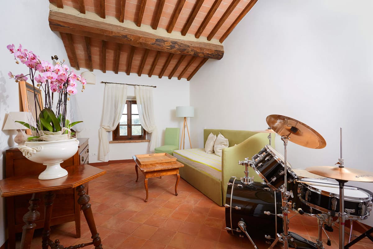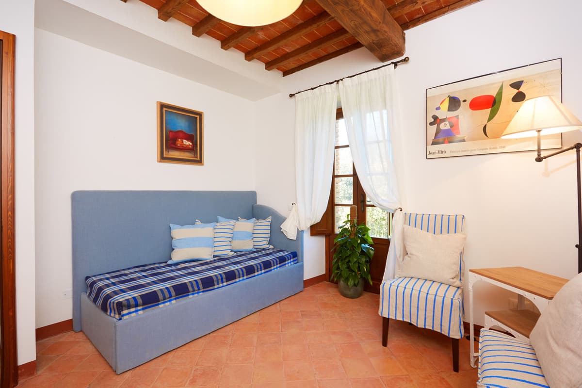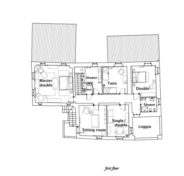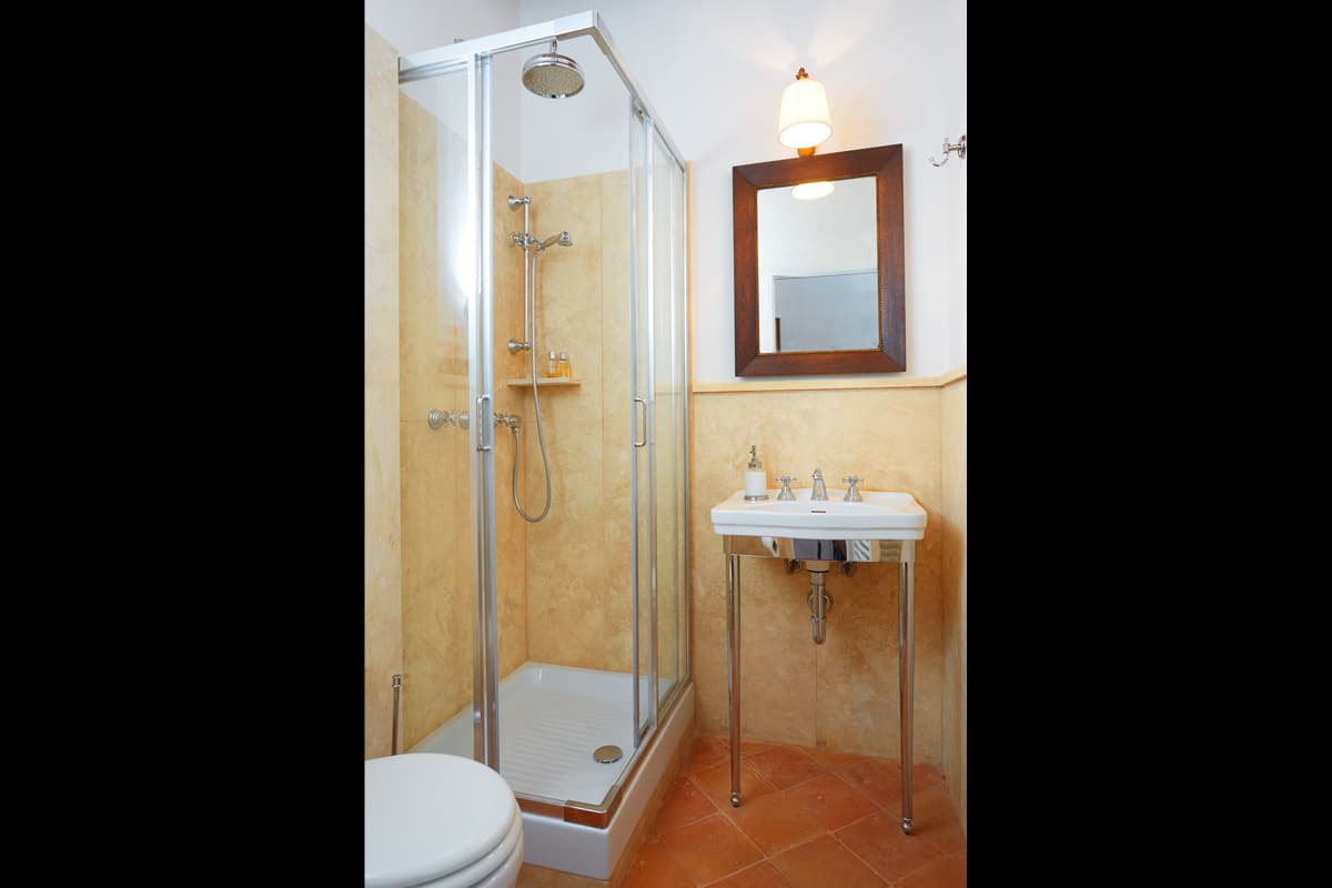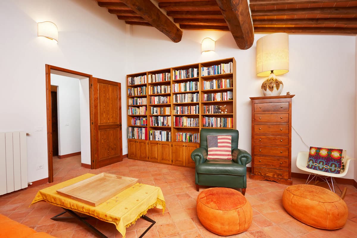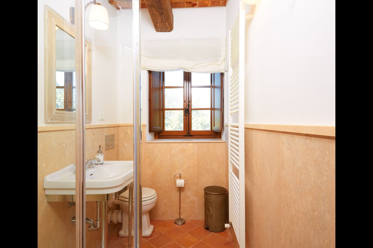 Further sleeping accommodations are on the first floor, reached both by internal and external stairs. There are two double bedrooms, one of which the particularly spacious master bedroom, a twin bedroom that can be set up as a double on request and a single room, easily converted into a double, which accesses the furnished loggia, itself a wonderful spot for an evening cocktail. Three shower rooms, one of which with two washbasins, serve guests on this floor. Also on this floor is a sitting room with sofa, bookshelves full of summer reading, and a door to the original external staircase landing that frames views of Casole d’Elsa. At the foot of the stairs are a barbeque and the old wood oven, which can happily prepare pizza for the whole crowd.