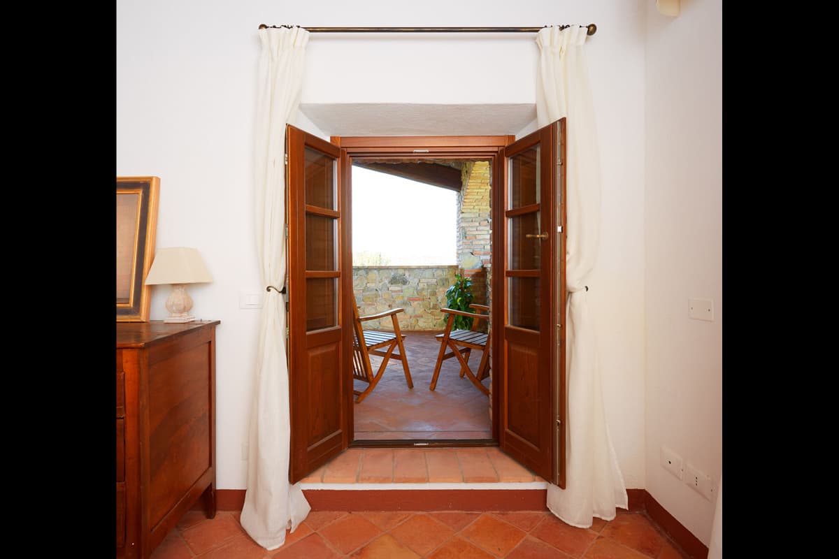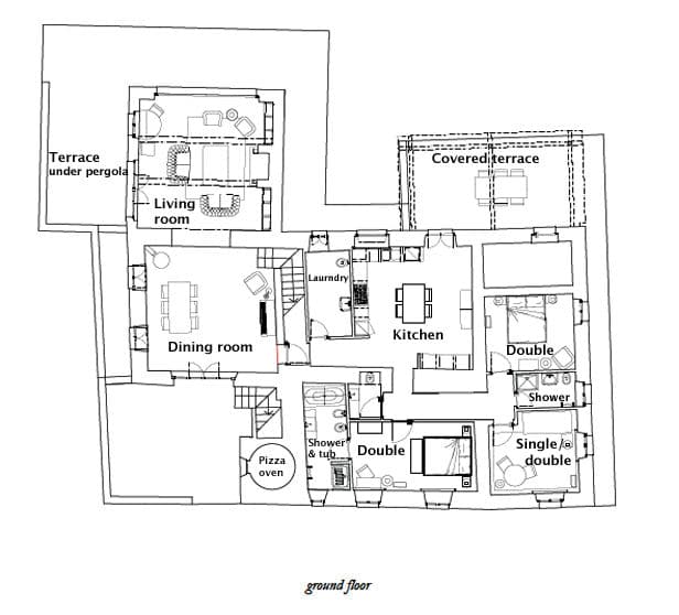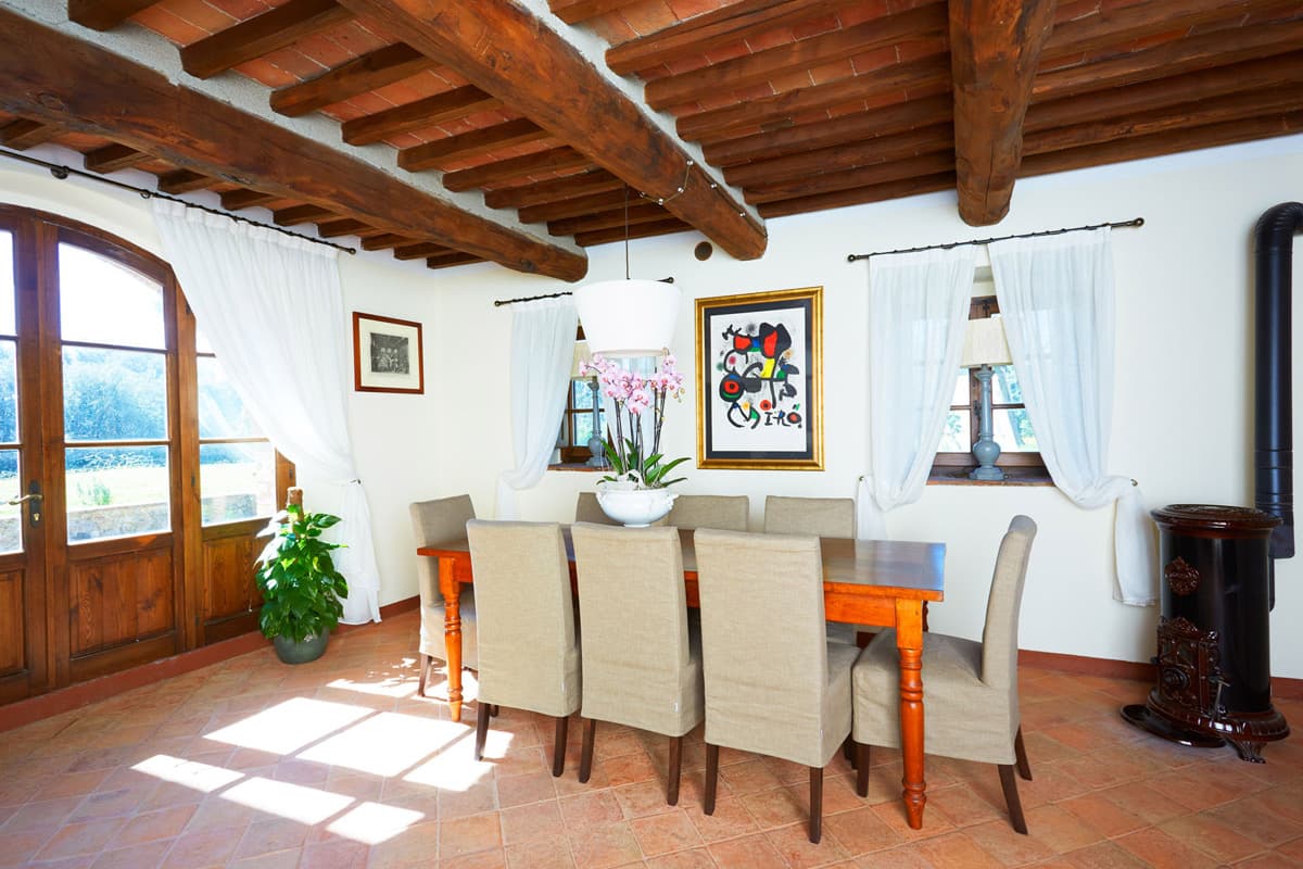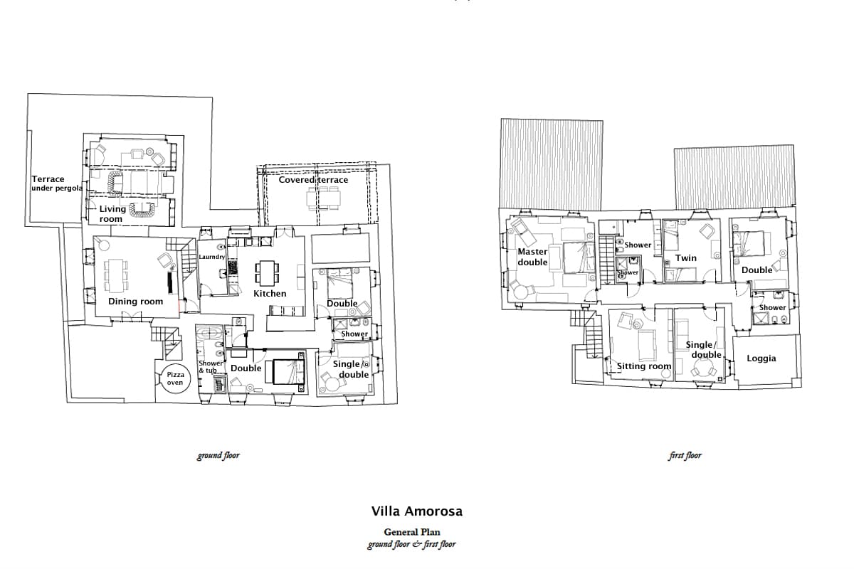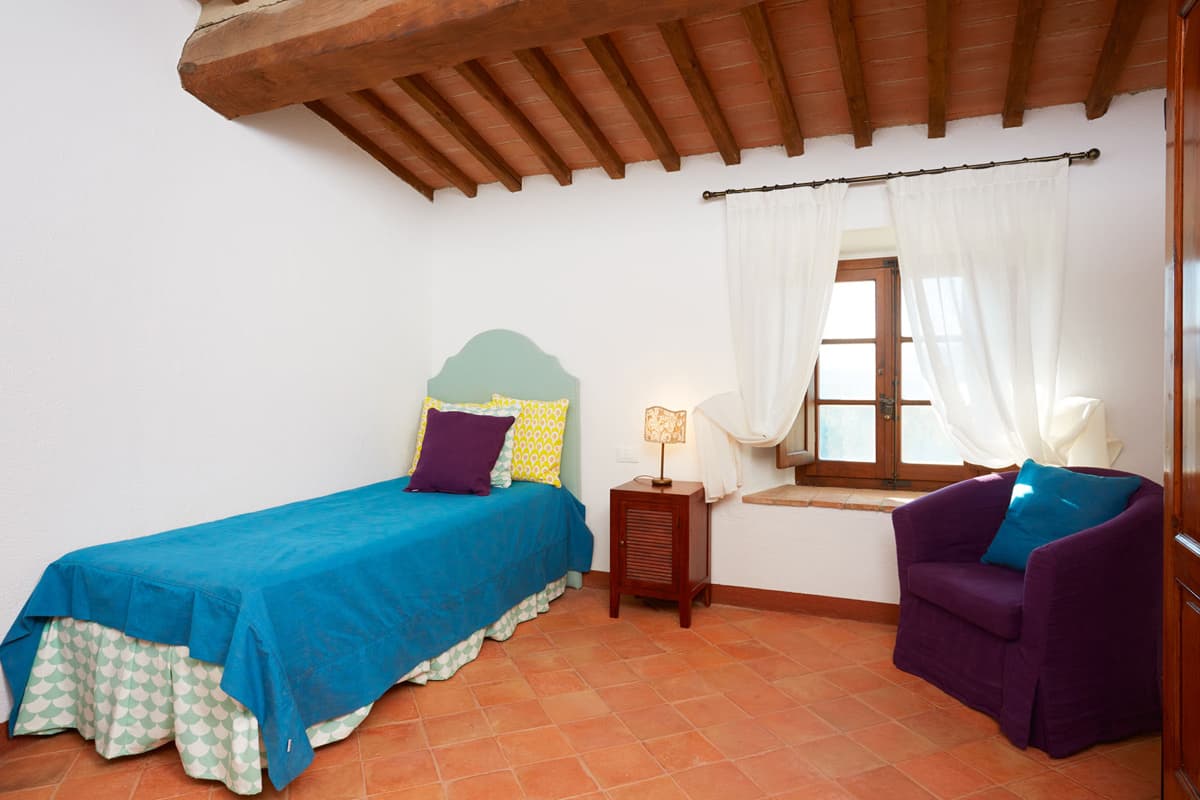 Further sleeping accommodations are on the first floor, reached both by internal and external stairs. There are two double bedrooms, one of which the particularly spacious master bedroom, a twin bedroom that can be set up as a double on request and a single room, easily converted into a double, which accesses the furnished loggia, itself a wonderful spot for an evening cocktail. Three shower rooms, one of which with two washbasins, serve guests on this floor. Also on this floor is a sitting room with sofa, bookshelves full of summer reading, and a door to the original external staircase landing that frames views of Casole d’Elsa. At the foot of the stairs are a barbeque and the old wood oven, which can happily prepare pizza for the whole crowd.