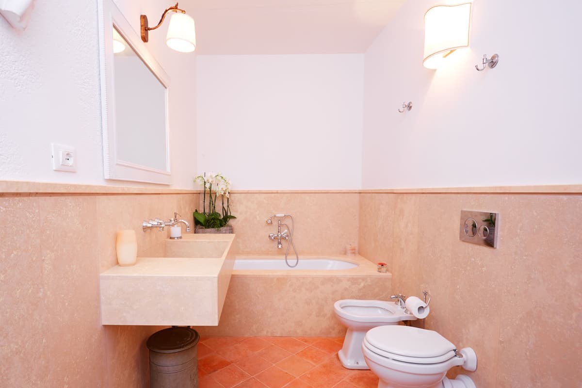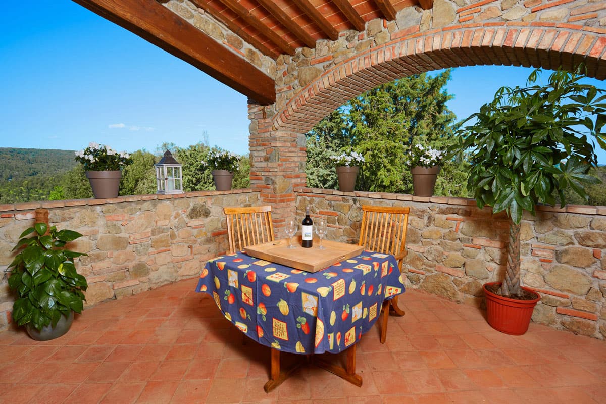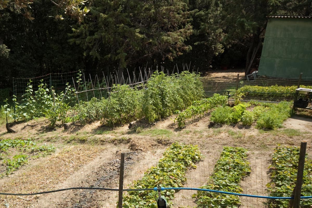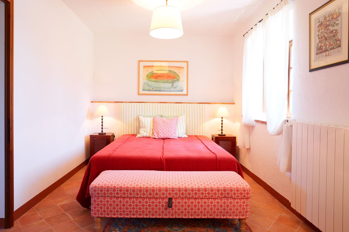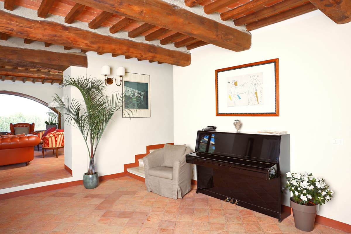 Further sleeping accommodations are on the first floor, reached both by internal and external stairs. There are two double bedrooms, one of which the particularly spacious master bedroom, a twin bedroom that can be set up as a double on request and a single room, easily converted into a double, which accesses the furnished loggia, itself a wonderful spot for an evening cocktail. Three shower rooms, one of which with two washbasins, serve guests on this floor. Also on this floor is a sitting room with sofa, bookshelves full of summer reading, and a door to the original external staircase landing that frames views of Casole d’Elsa. At the foot of the stairs are a barbeque and the old wood oven, which can happily prepare pizza for the whole crowd.