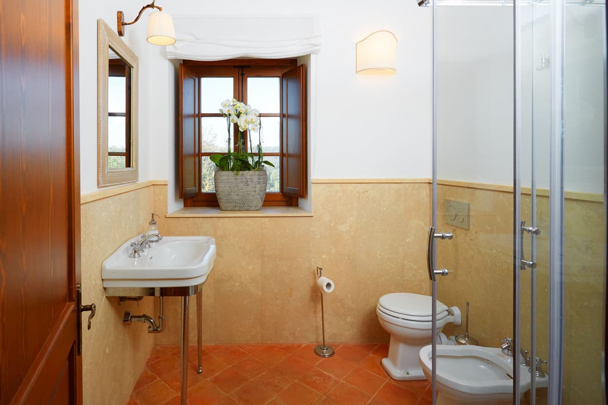 A wide hallway from the dining room leads past the laundry room to the big, square kitchen with a farmhouse table, antique Tuscan dresser and granite countertops around a large 6-hob cooker. Glazed doors open onto a furnished shaded patio, an enticing outside dining area looking down towards the pool. A sliding door off the kitchen access a guest WC, and a corridor off of which are three bedrooms. There is a double bedroom with ensuite bathroom with separate shower, and two bedrooms that share a shower room - a double and a bedroom with independent garden access, whose single sofa is easily converted into a double bed.