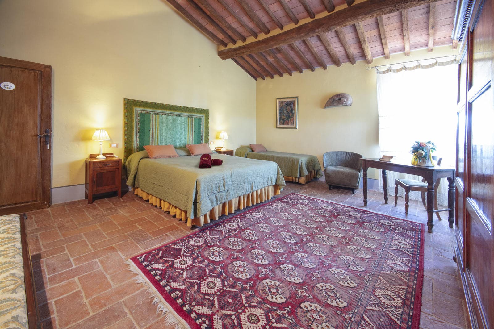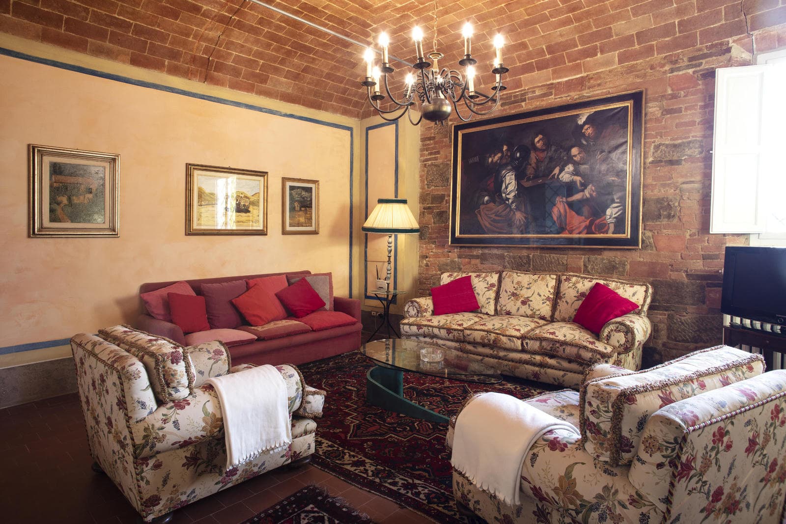 The villa has a spectacular pool on a natural panoramic terrace looking out over the surrounding vineyards, as well as a smaller pool for children (6×6 and 50 cms. depth). In front of the villa a large umbrella shades a large area for alfresco outdoor dining. The interiors are spacious and decorated with old-fashioned elegance, with large old-school paintings on the walls and comfortable sofas.