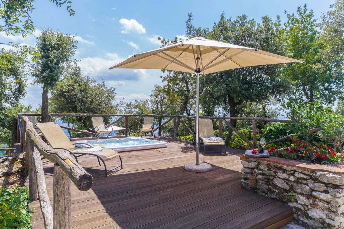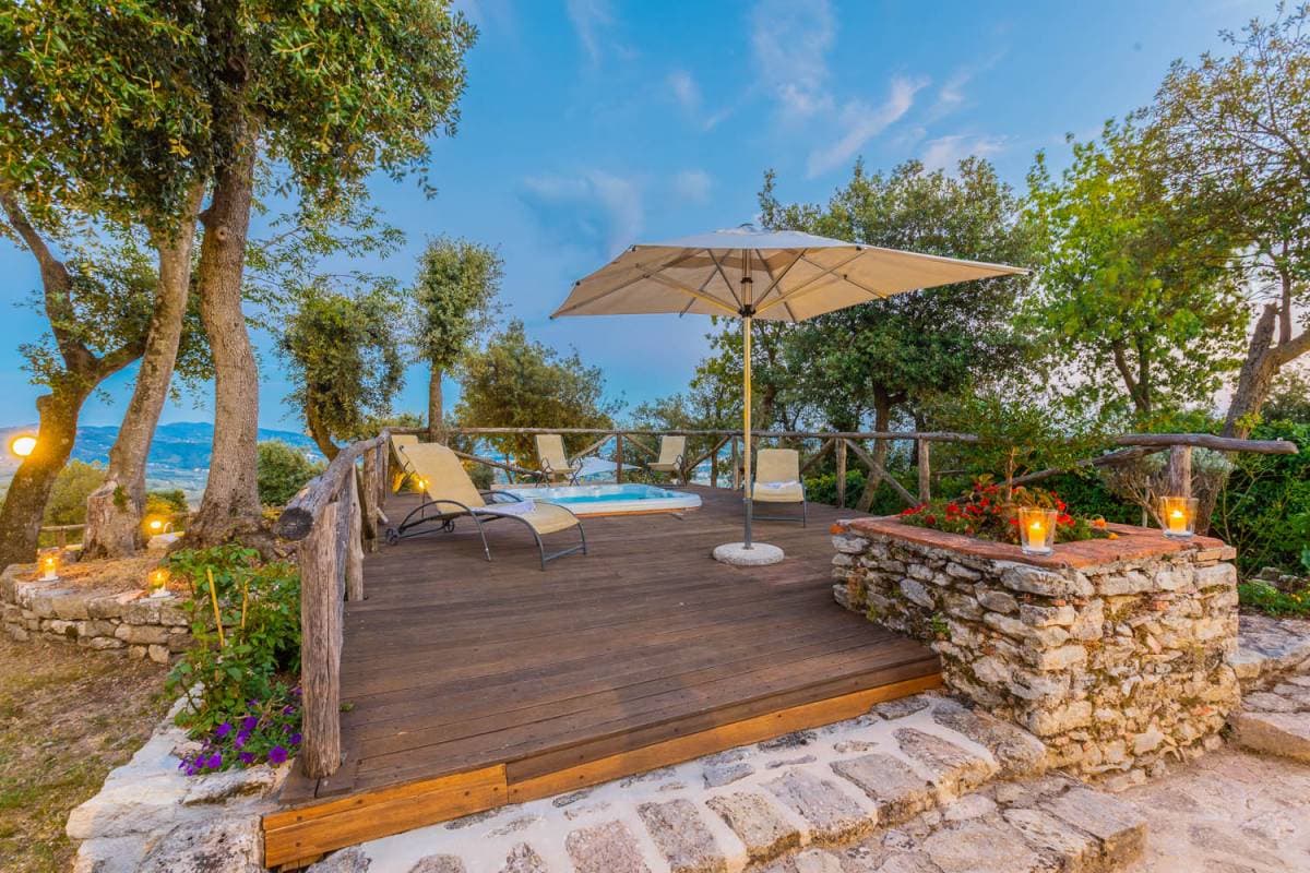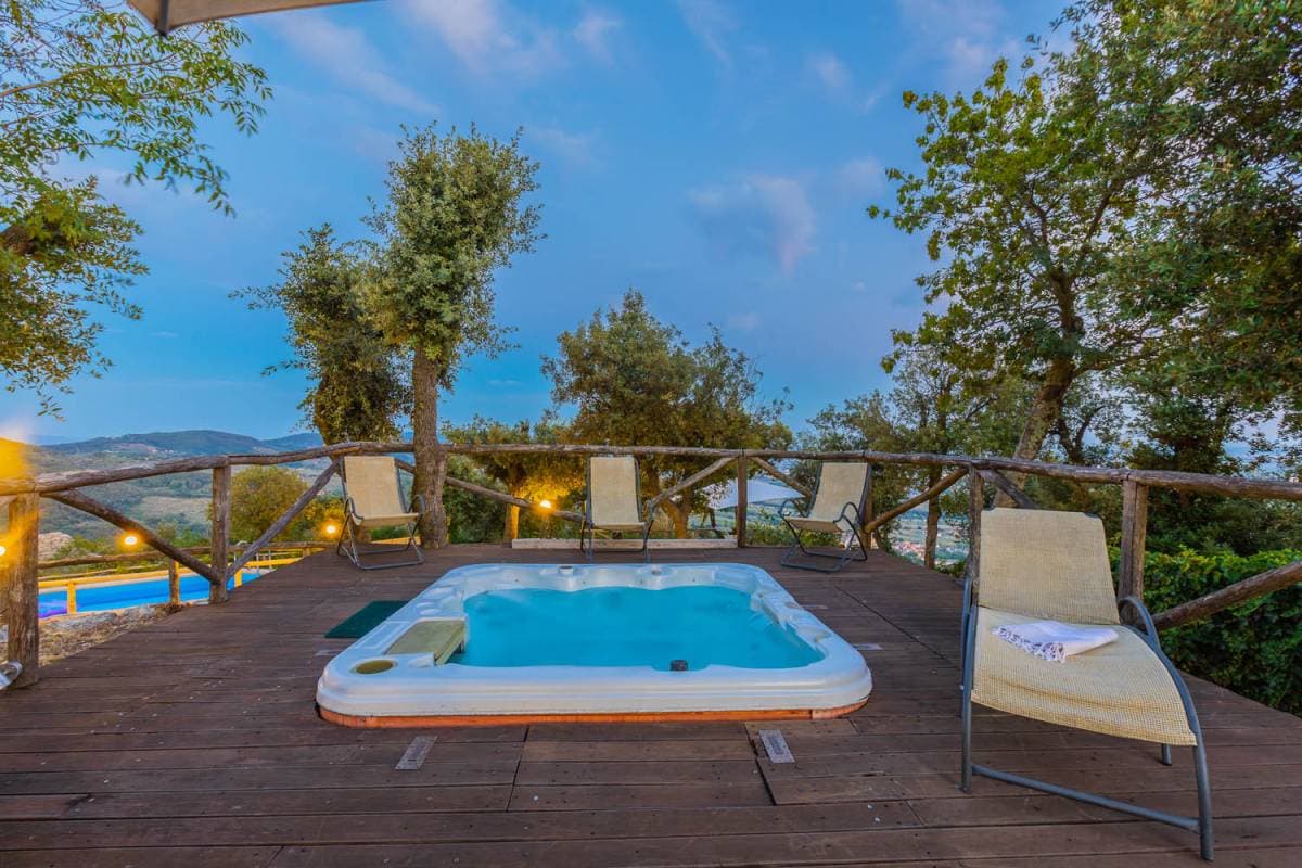 The swimming pool is an out-of-ground one because of the delicacy of this archeological site, but is easily accessed on the flat because of the ground's terracing. Closer the the house a jacuzzi is surrounded by lush trees.