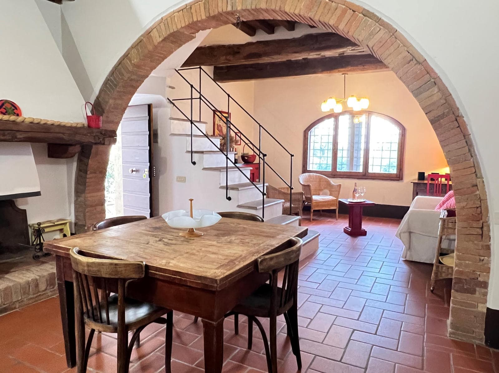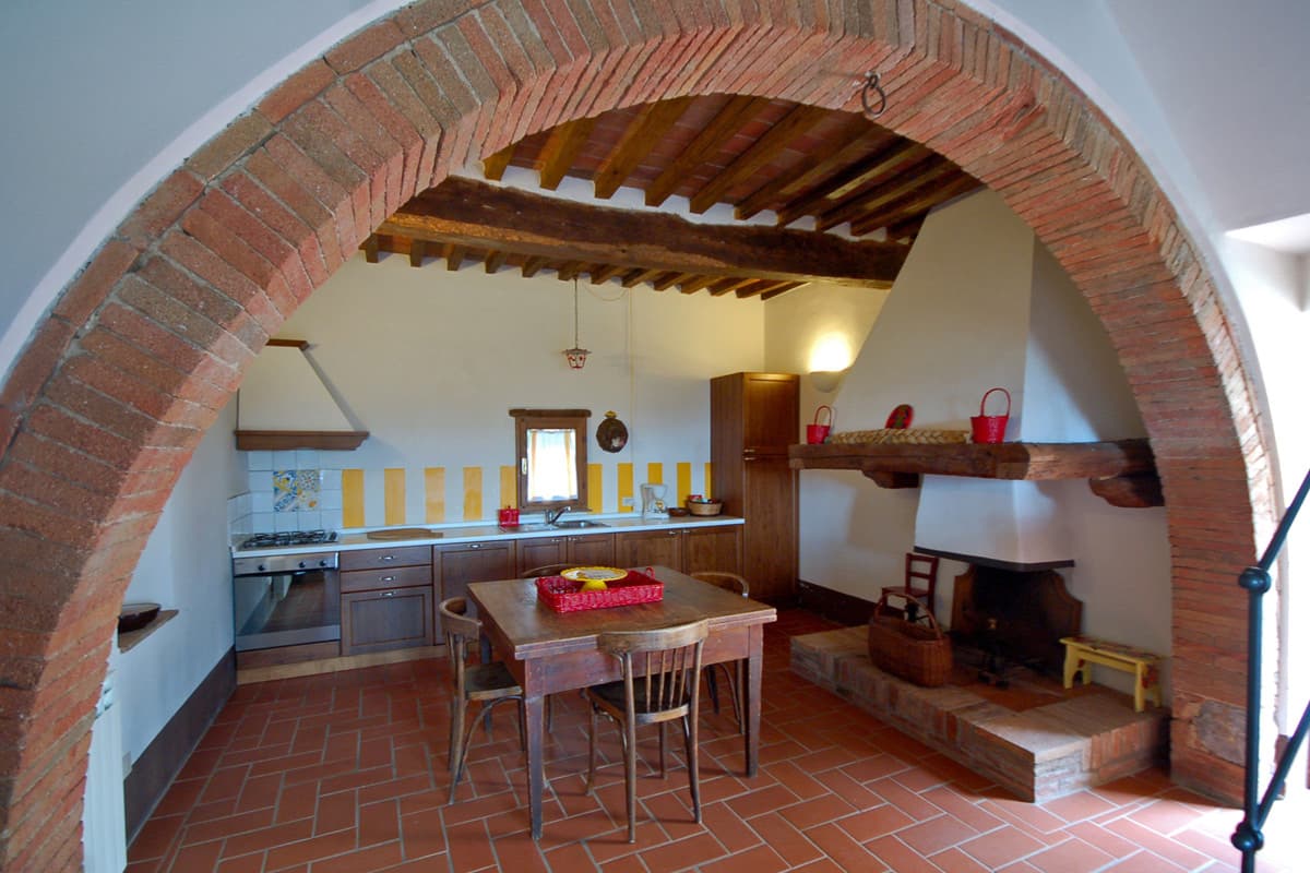 The front door opens from the flower-filled piazza into a lovely, beam ceilinged entry with a wide brick arch separating the kitchen from the sitting room.