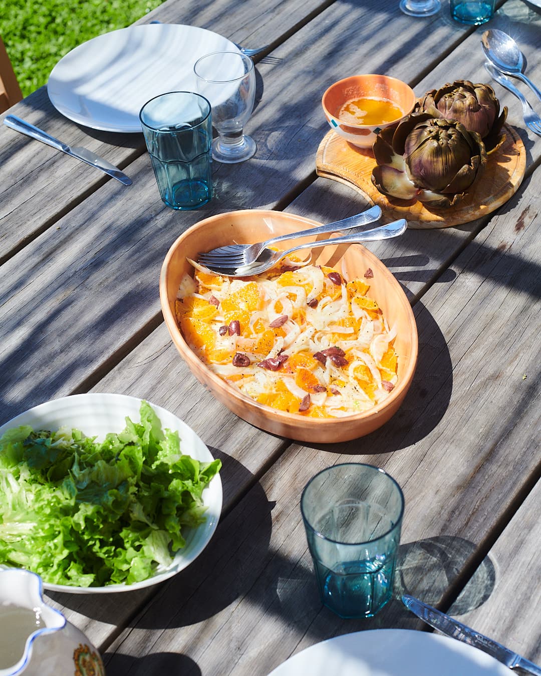 One enters the house directly into the large country kitchen. The dimensions are generous, with modern appliances, travertine countertops and a wooden table good for preparation. A furnished patio just outside is perfect for eating alfresco.