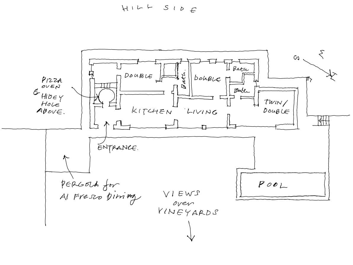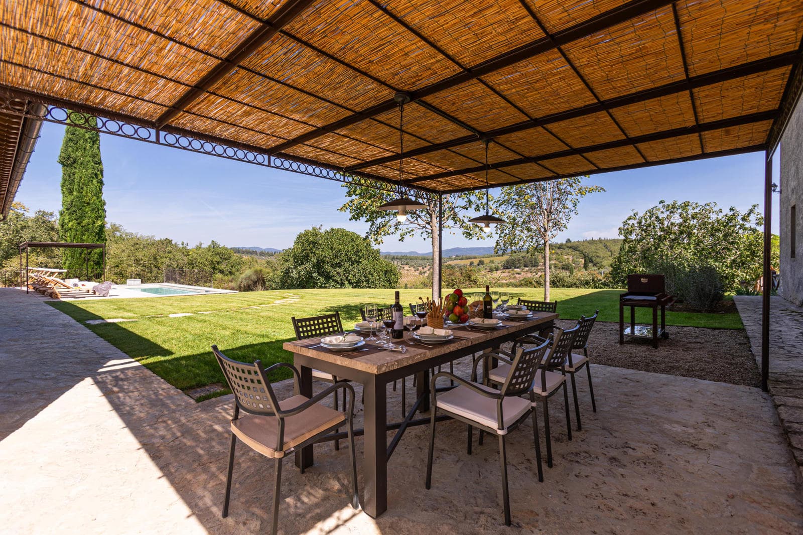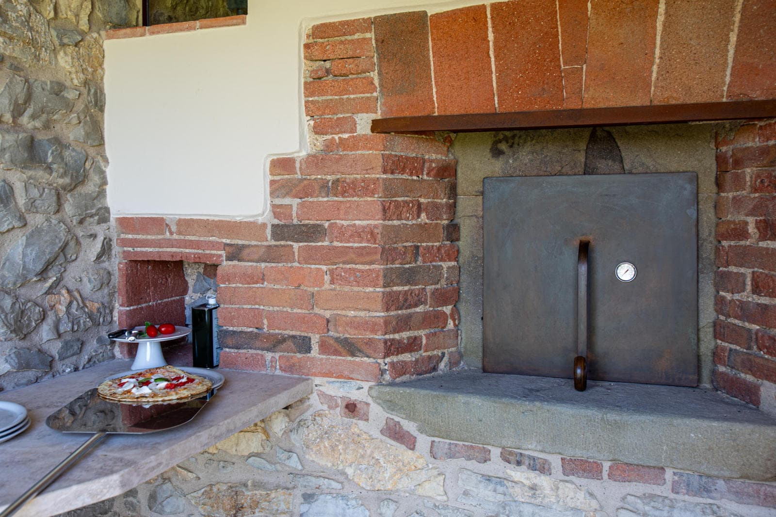 The entrance is from a covered loggia that also shelters a working wood pizza-oven, perfect for meals under the shaded pergola nearby.