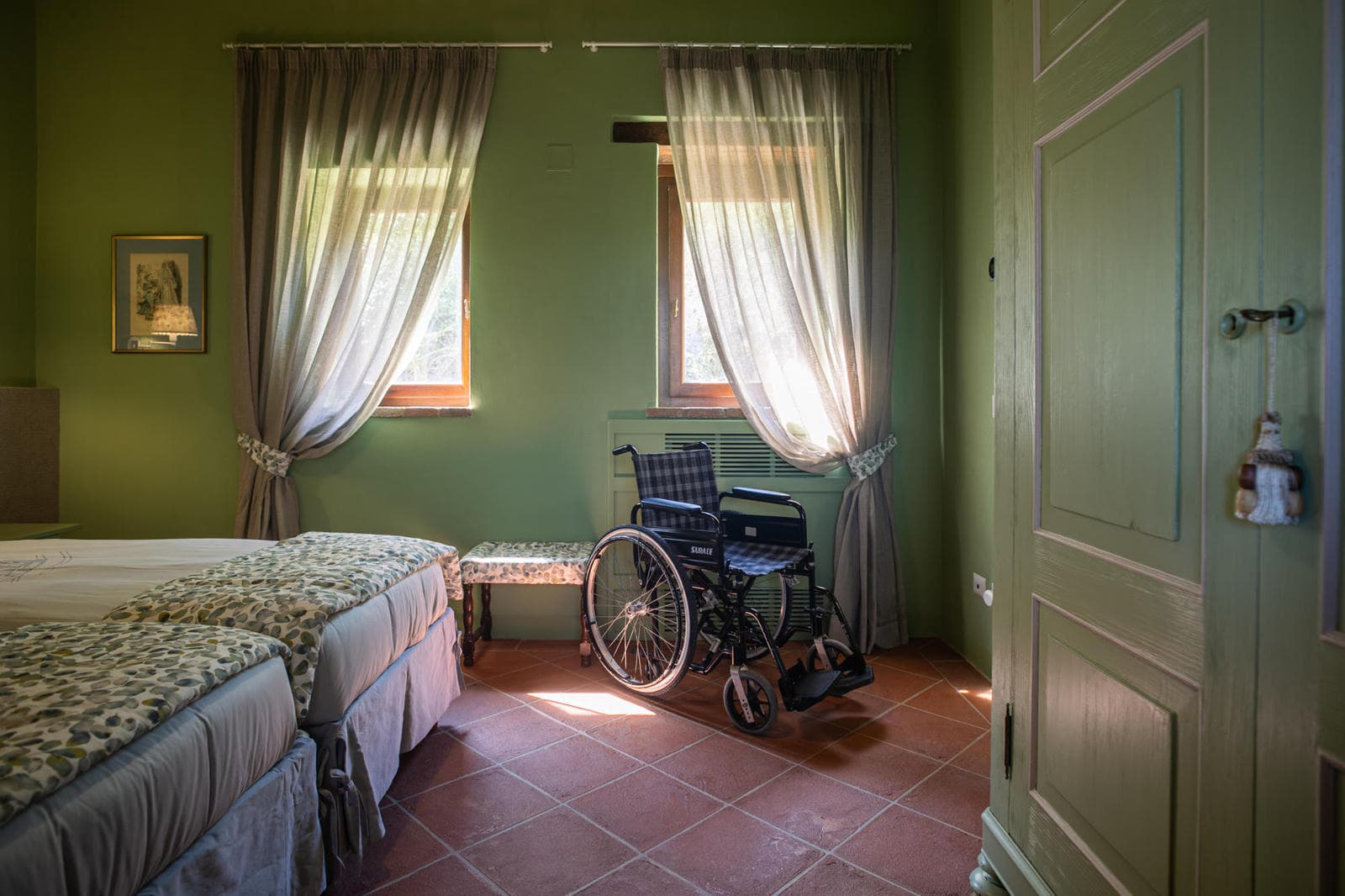 Inside you'll find a kitchen/dining-room, a living room and a large double bedroom with an ensuite bathroom, all of which have windows onto the lawn and swimming-pool. One of the bedrooms and its ensuite is accessible to those in a wheelchair, with a wide-entry bathroom and shower door, angled mirrors and helpful handles.