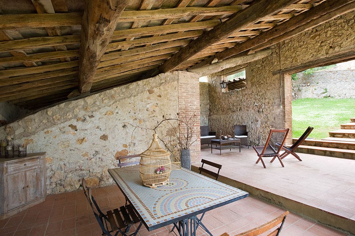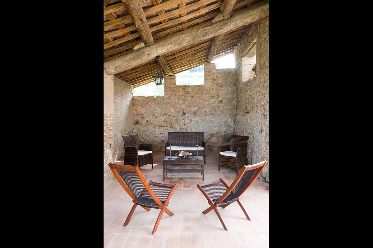Some of the farmhouses and agricultural buildings on the vast Montestigliano estate have been very carefully converted into pleasing, comfortable houses and apartments. Guests on the estate share two swimming pools, one reserved for those who want peace and quiet, the other, further from the houses, for allowing free rein to summer holiday fun. Guests at all the properties may wander at will all over the estate. Part of the lands front the River Merse, which has excellent swimming and is protected for bathers by the Sienese authorities. The tiny village of Torri, with its famous monastery and striped cloisters is two minutes away by car, while there are pizzerie and restaurants within a few minutes' drive. A very important extra here is provided by the charming owners who will unobtrusively keep out of your way or happily go out of their way to help you, providing endless extra services if you require them, from sending faxes, arranging balloon trips, providing touring information, to translating at the doctor's. During the summer concerts and exhibitions are often organised in the ancient granary, an extraordinary lofty space (14 X 28 m.) spanned by great arches laced with tie bars. This barn is also very suitable as studio space for art courses or conferences, and the rooms below, next to the estate offices, include a games room with billiards, TV, ping pong, a dining room, a catering kitchen and a small gift shop. The little restaurant provides delightful suppers twice a week.