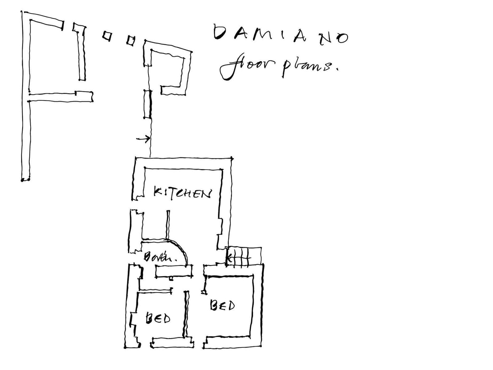Entrance to the house is from the front door, which faces the drive up to the center of the estate. To the right of the door is the large main room which combines a living area with a sofa facing a traditional Tuscan fireplace and a dining table for four. A low dividing wall separate the living area from a compact, well-planned kitchen. To the left of the entry there is a short corridor off of which are two bedrooms, a double and a single, and a shared bathroom. Of of the favorite living areas is actually outside the house, in the very spacious covered patio, ideal for dining al fresco and gathering to plan new excursions. or just enjoy the evening air. Guests at Damiano and Casa Ropoli share a laundry room with washing machine in a room below Casa Ropoli.