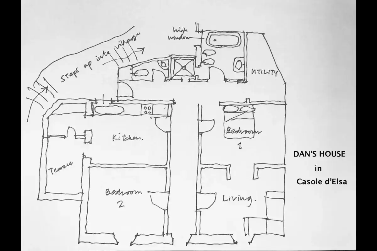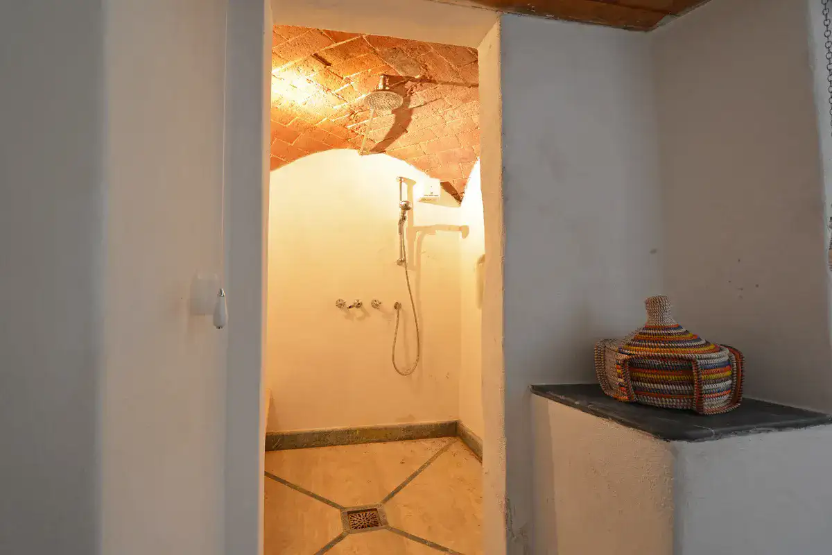 Opposite the kitchen is the spacious master double bedroom which has a curtained opening leading to a spacious living room with an L-shaped sofa, sat. TV and views towards the hills of Chianti. Across the corridor from the living room is another large double bedroom also enjoying the same views. Off the entrance hallway are a a full bathroom with a separate shower stall with a beautiful marble floor, a store room/laundry room and a separate WC and washbasin. The stone wall at the rear of the bathroom is part of the medieval village wall, exposed during restoration. It stitches an evocative juncture from the Middle Ages through to the elegant 19th century feel of the house with modern equipment completing the transition to the present day.