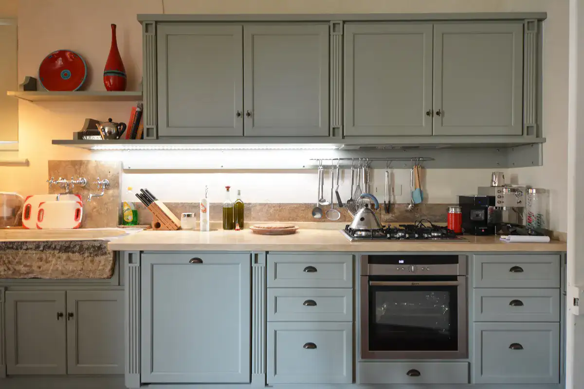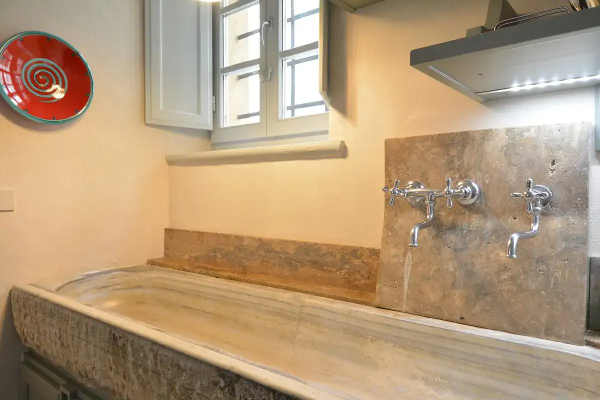 The kitchen has a large ancient marble sink, rescued from a demolished building