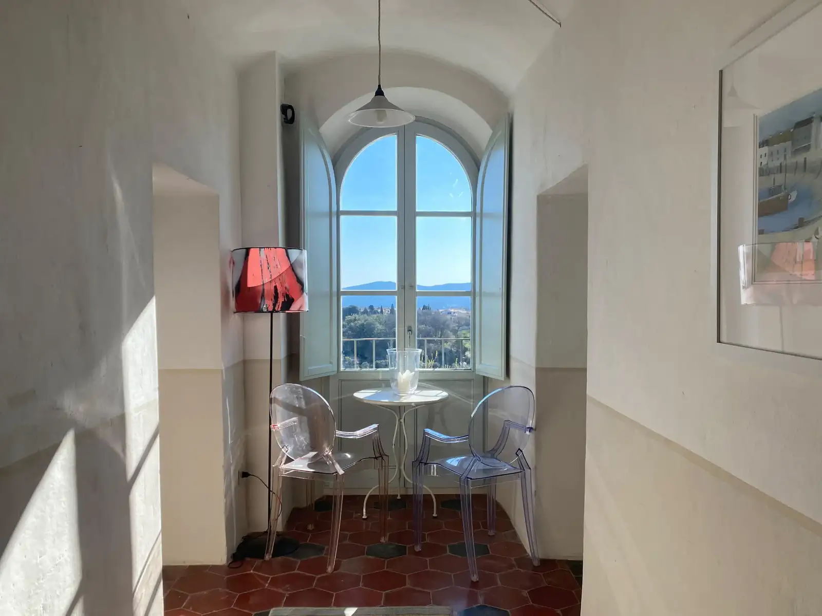 The french windows have a small Juliet balcony and wonderful Tuscan views.