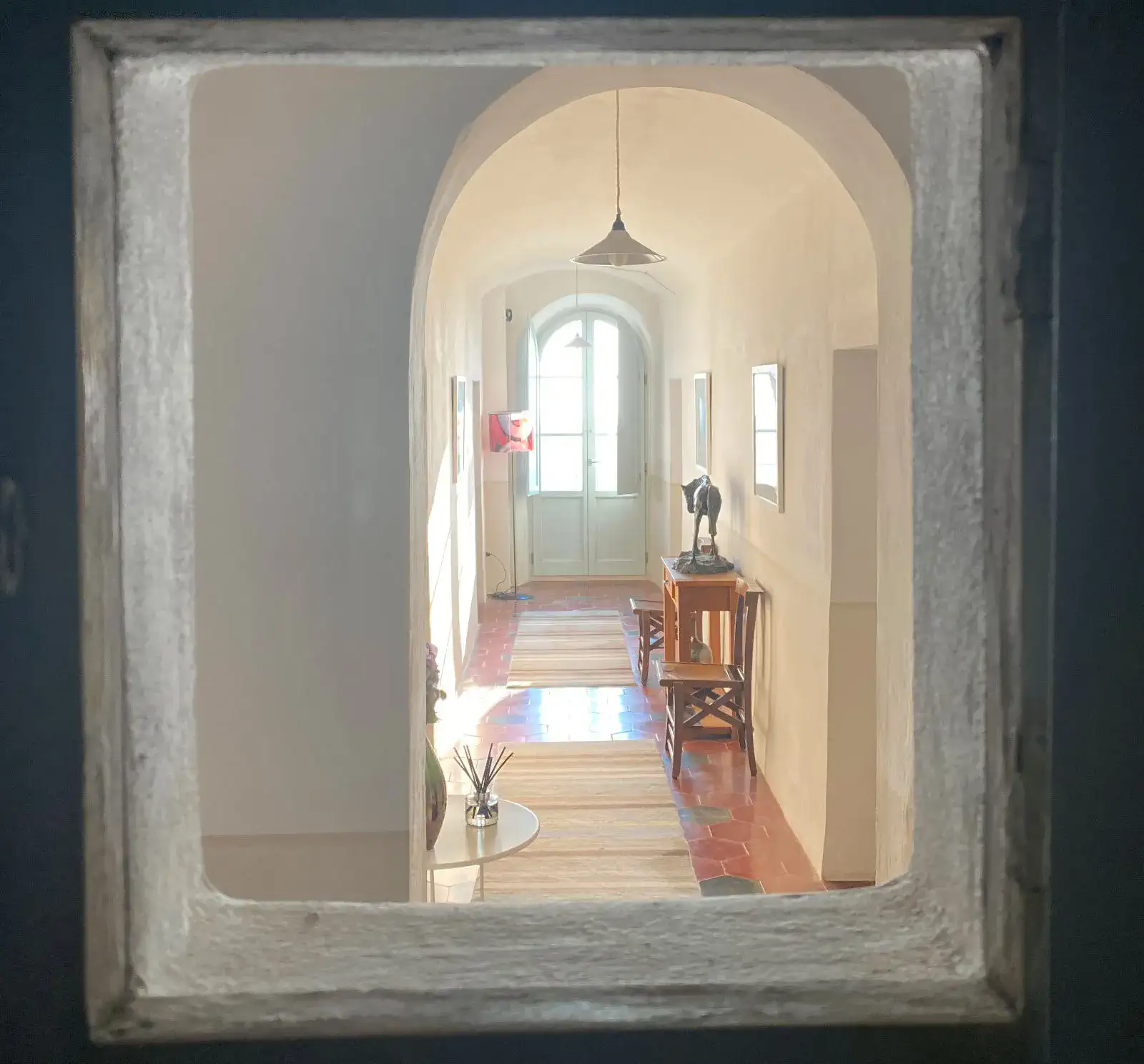 The central corridor has a beautiful view at the end from french windows