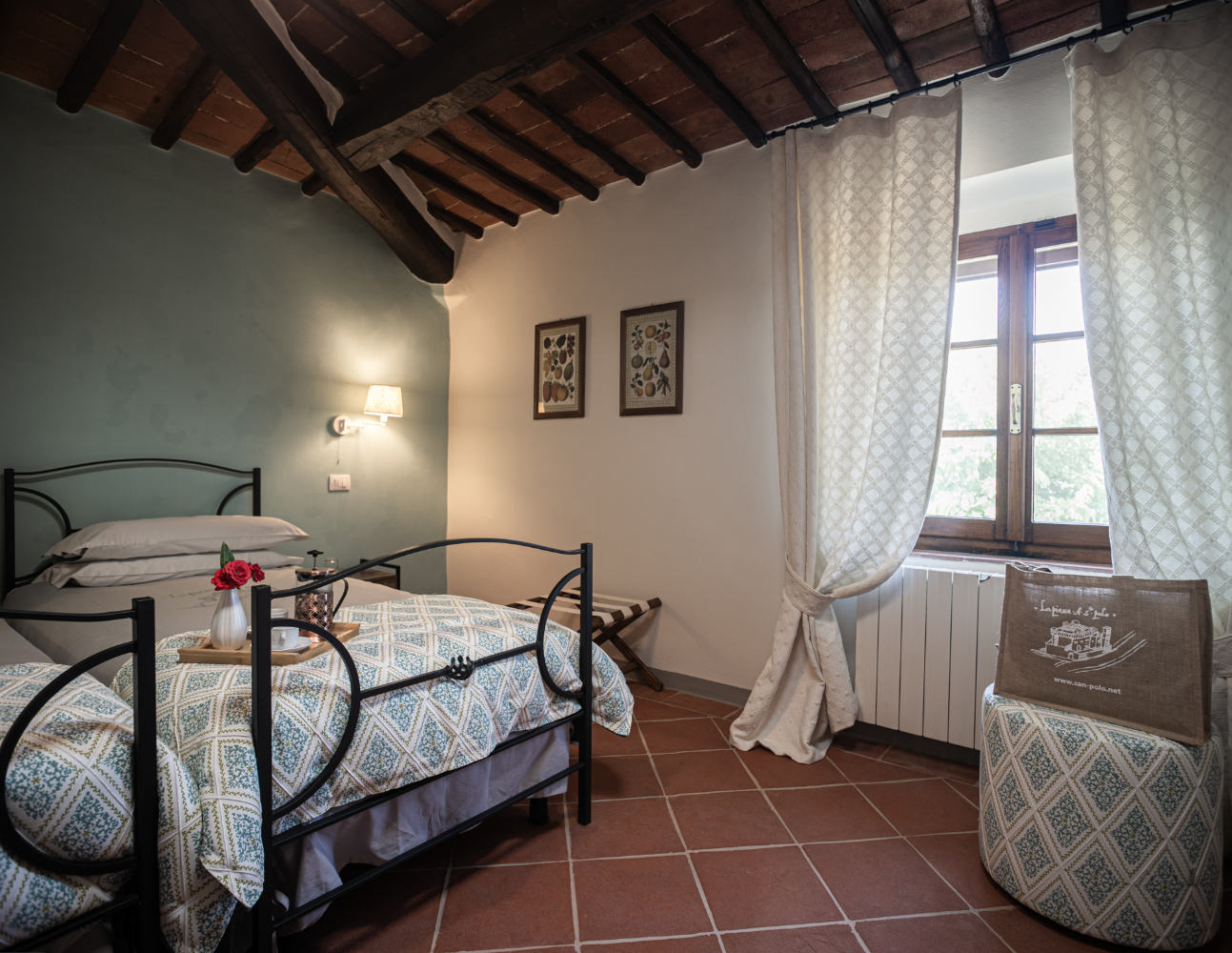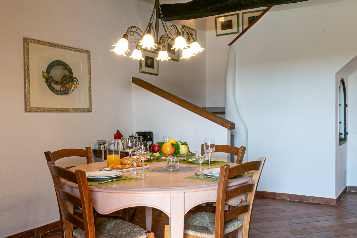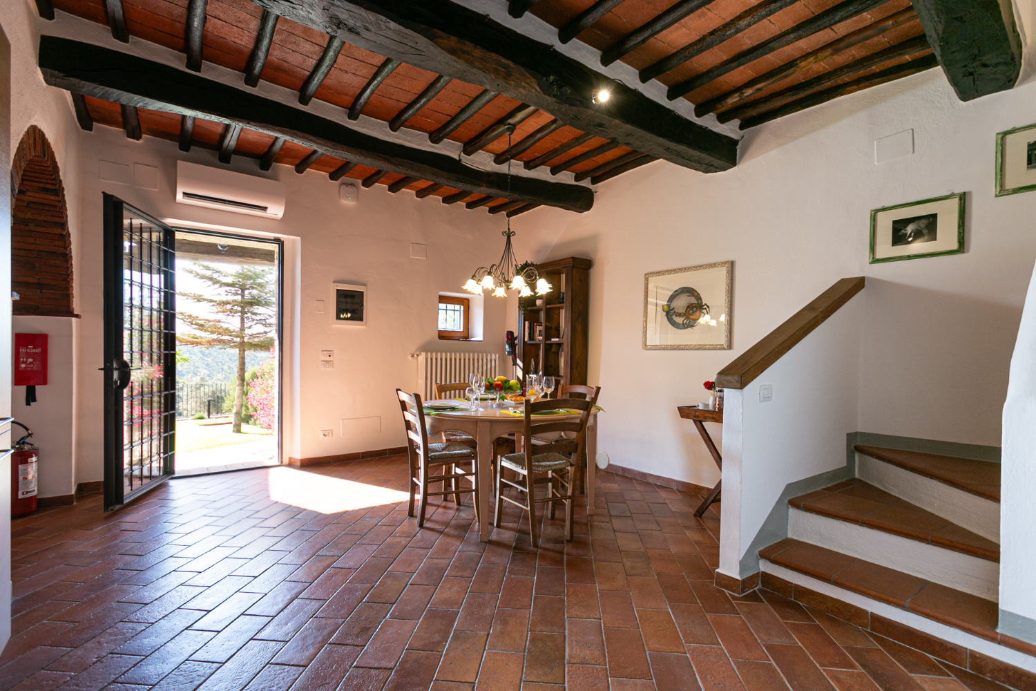 Casa Giacco is a two-storey apartment set within the historic buildings of the Castello di San Polo in Rosso estate, surrounded by vines and the oak-covered slopes typical of this part of Chianti. The apartment has been renovated to a practical, comfortable standard while keeping the terracotta floors and beamed ceilings that are traditional in Chianti farmhouses.