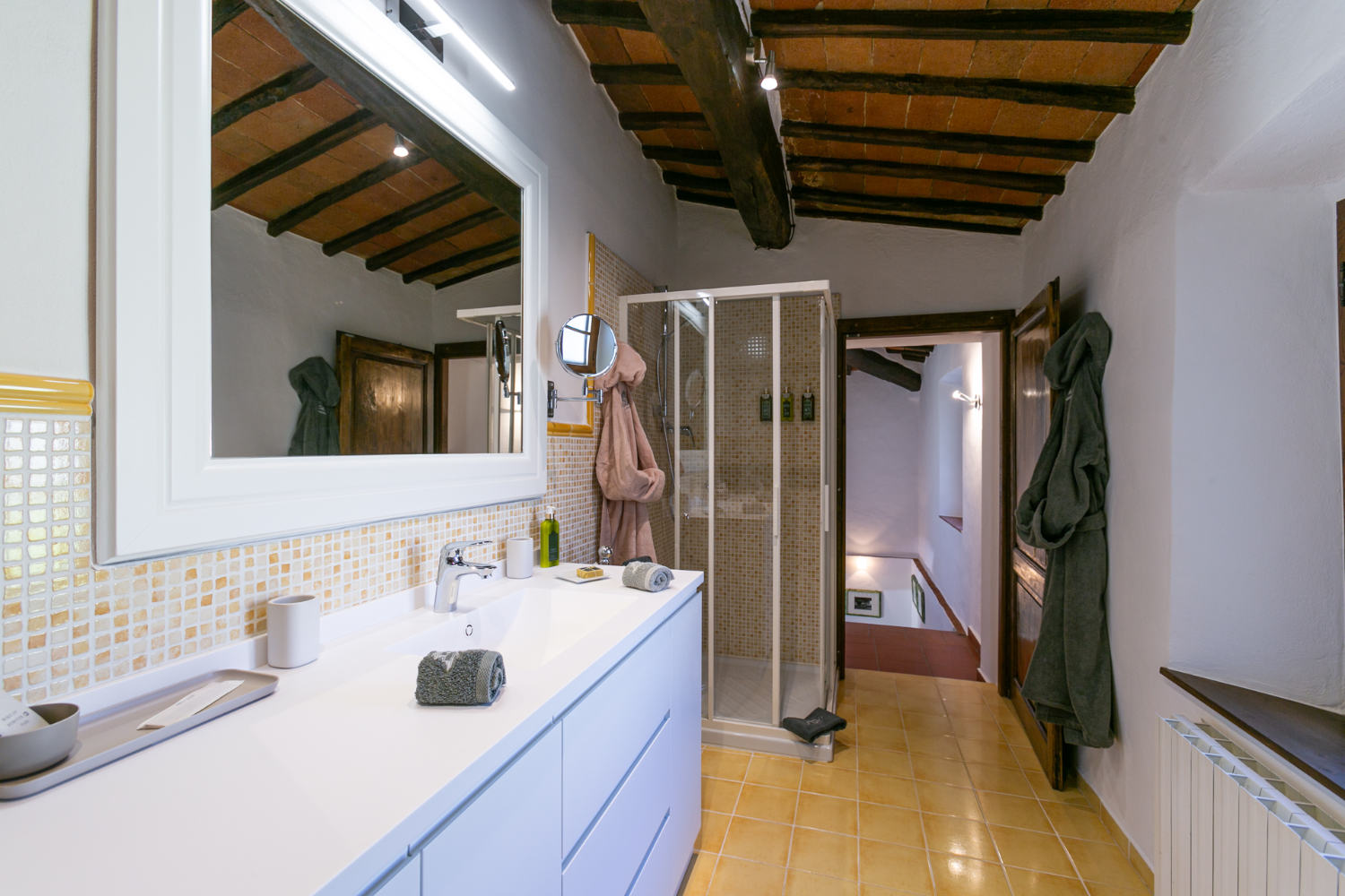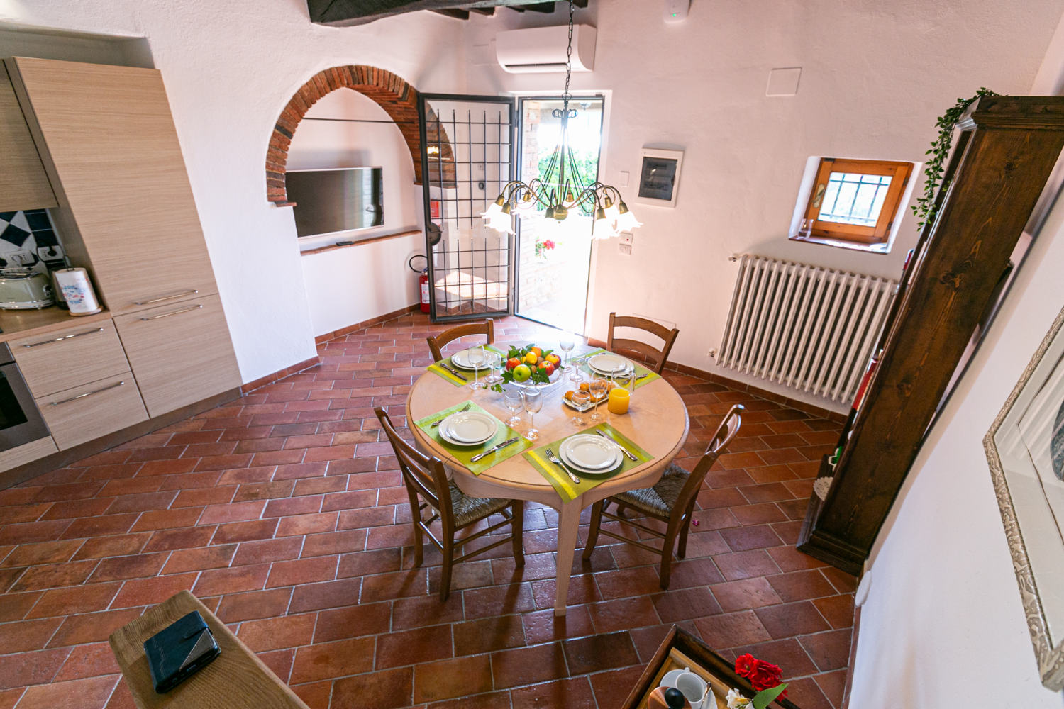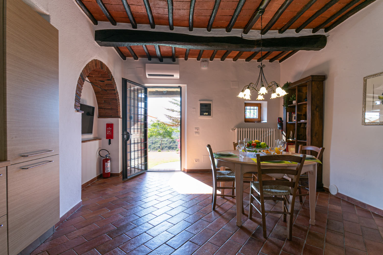 Casa Giacco is a two-storey apartment set within the historic buildings of the Castello di San Polo in Rosso estate, surrounded by vines and the oak-covered slopes typical of this part of Chianti. The apartment has been renovated to a practical, comfortable standard while keeping the terracotta floors and beamed ceilings that are traditional in Chianti farmhouses.