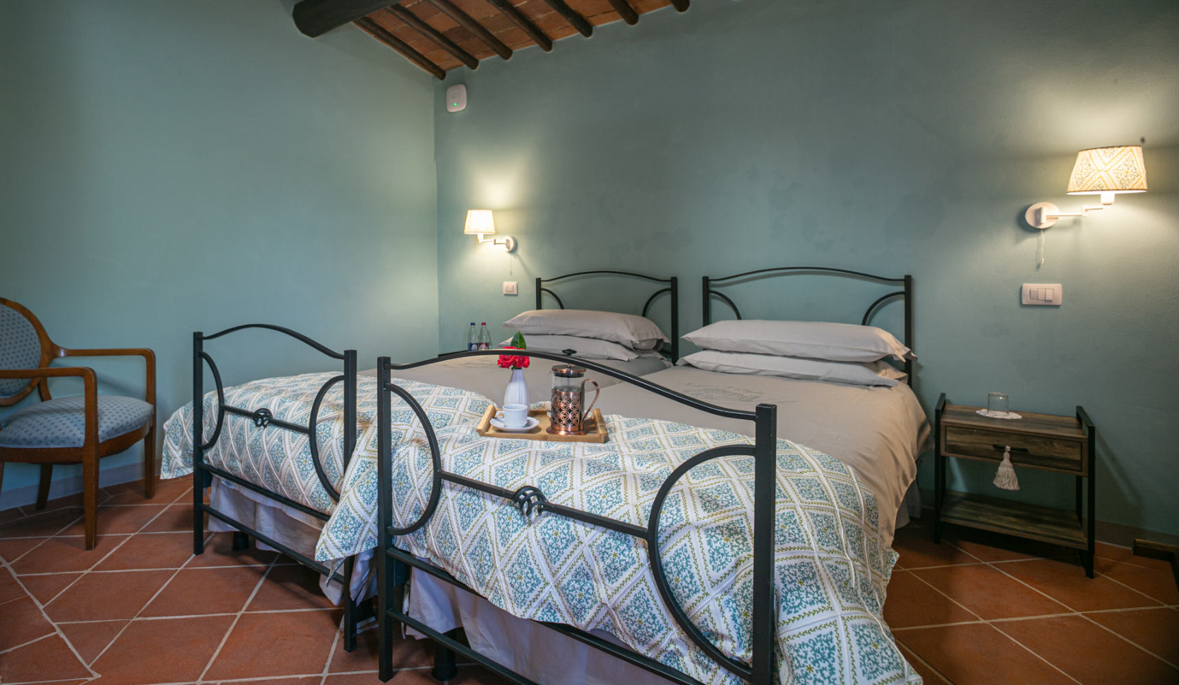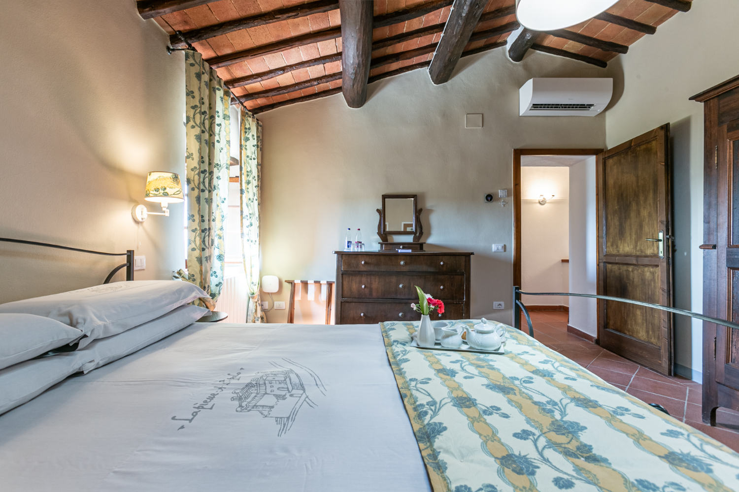 If you want a pool and a private garden with no neighbours in sight, look elsewhere on this site. If you want to wake up inside the Chianti Classico zone with a glass of the estate's own wine on the table and Castello di Brolio visible on the next ridge, Giacco is the right choice.