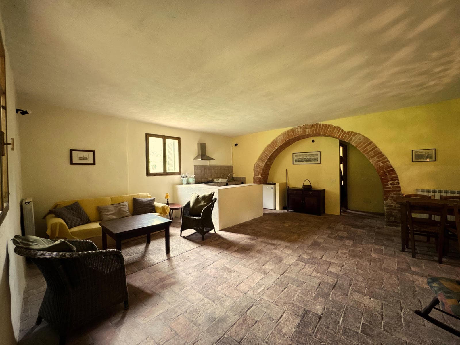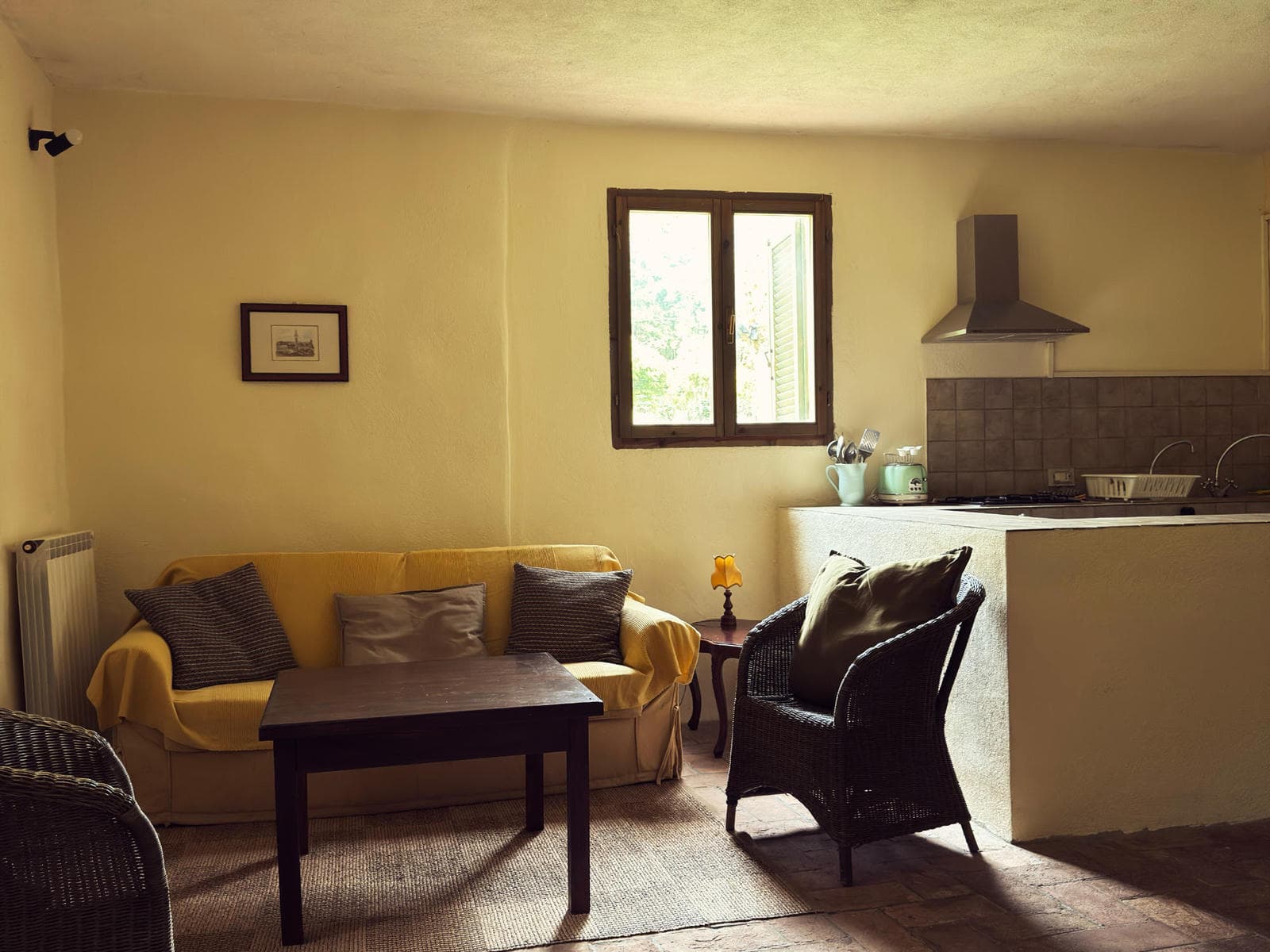 Il Nido is a spacious apartment for two on the ground floor of the main farmhouse. The conversions are a harmonious blend of ancient tradition and modern comforts. All the apartments have a quiet, cool and restrained atmosphere with simple, traditional Tuscan furniture. The hand of the artist owner is seen in the soft colors that grace the apartment walls and in the blossoms that drape arch and pergola alike.