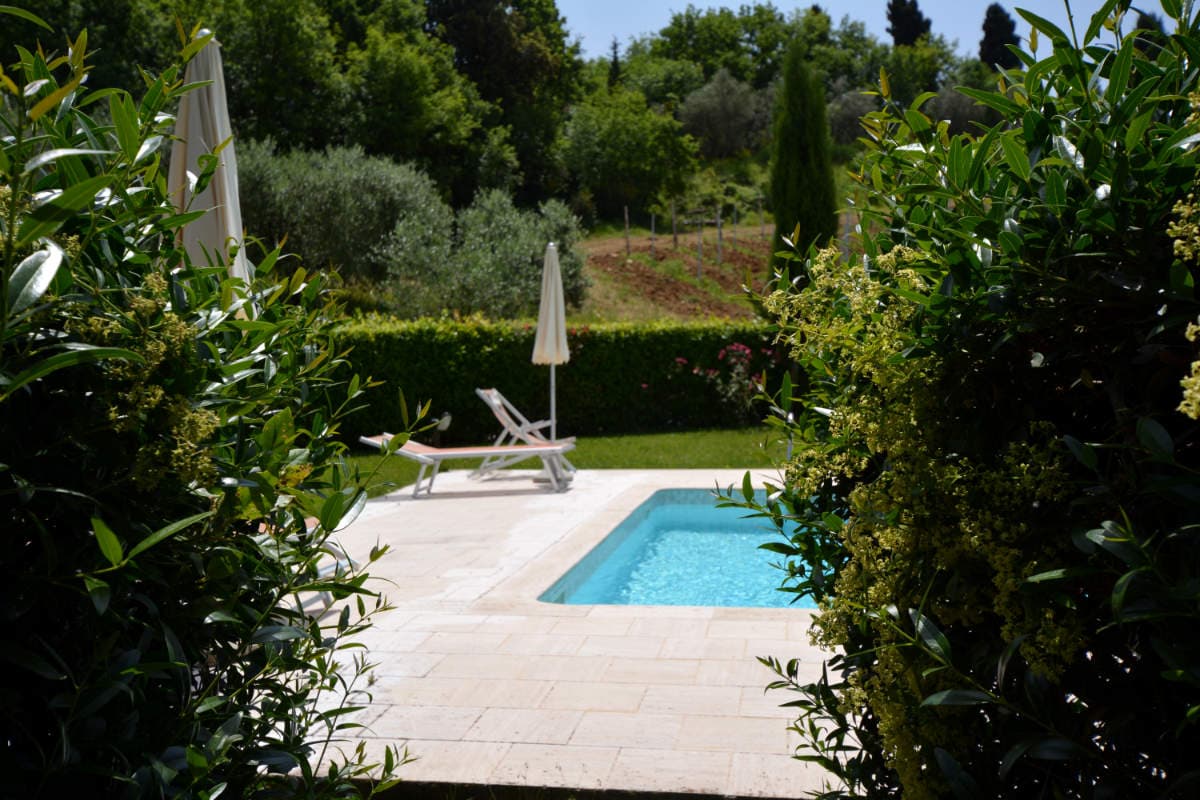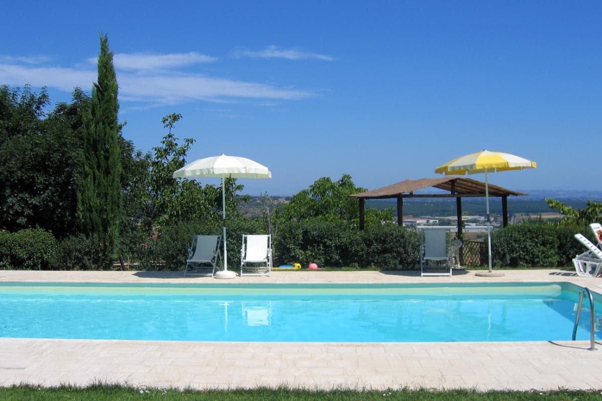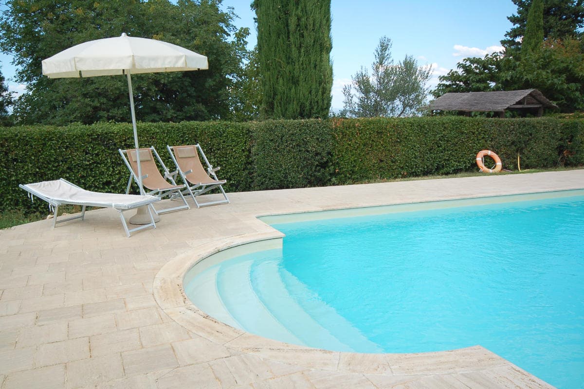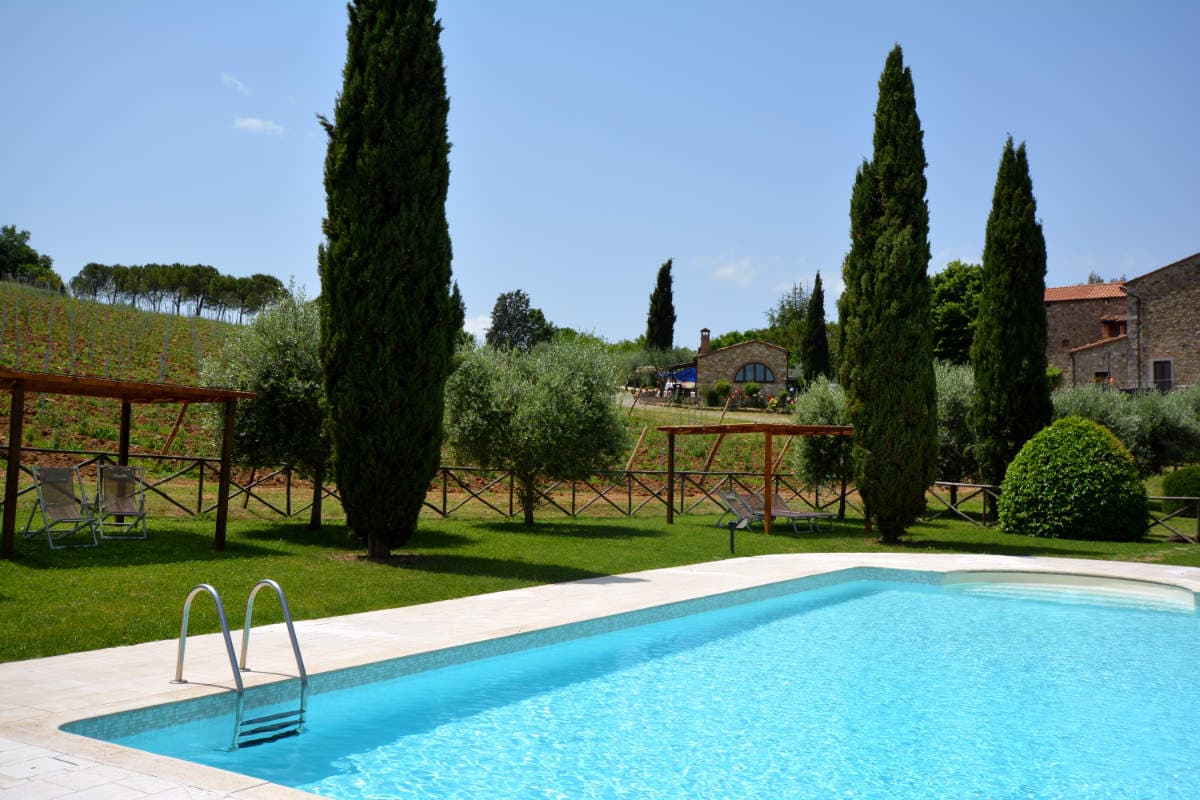 With a wide, travertine-tiled surround, and plenty of sun loungers, the swimming pool is a soft ochre colour, blending comfortably with the olive groves and vineyards. Set in a delightful position down the hillside from the farm, it has extensive and beautiful views across to the Chianti hills.