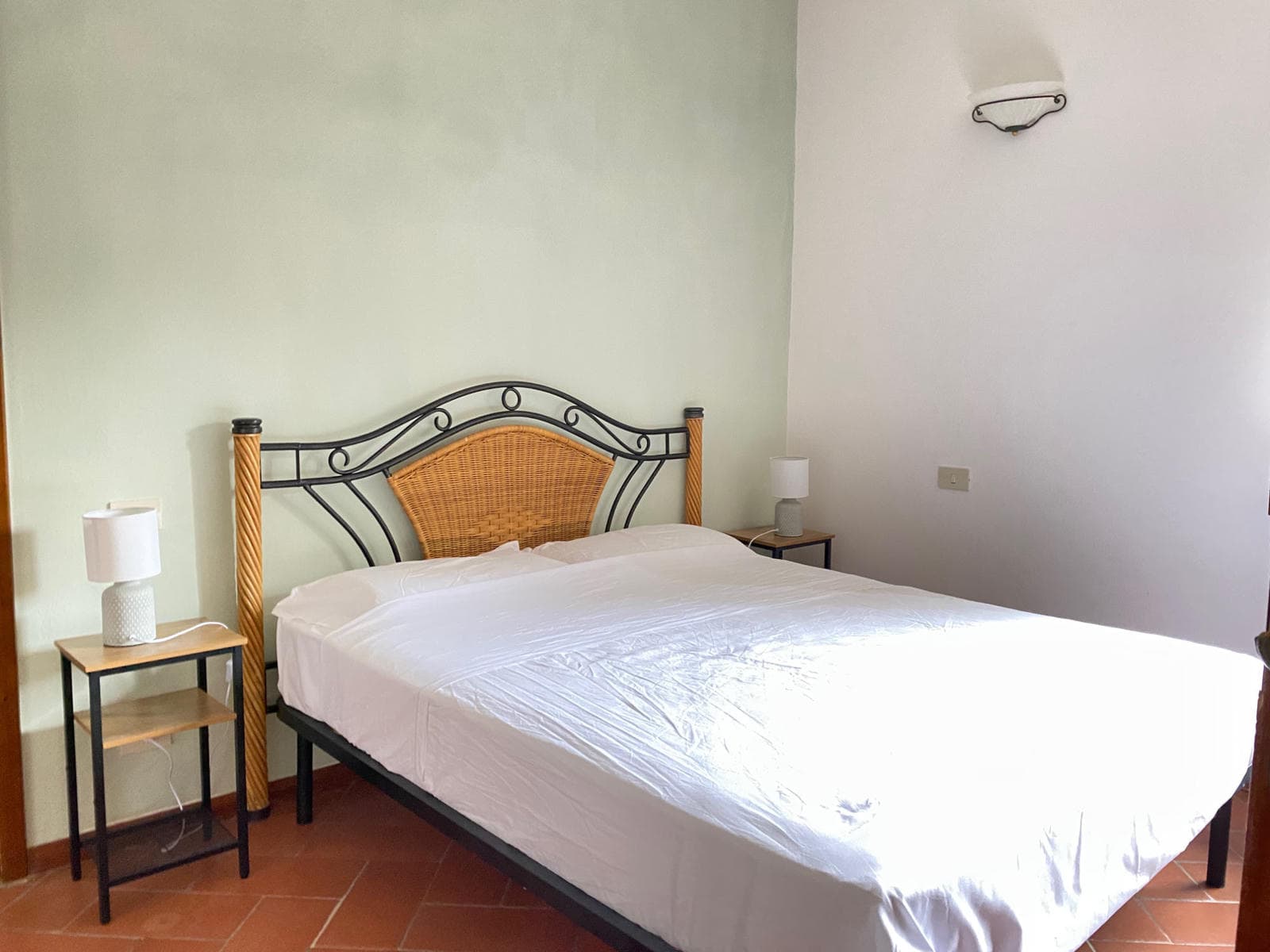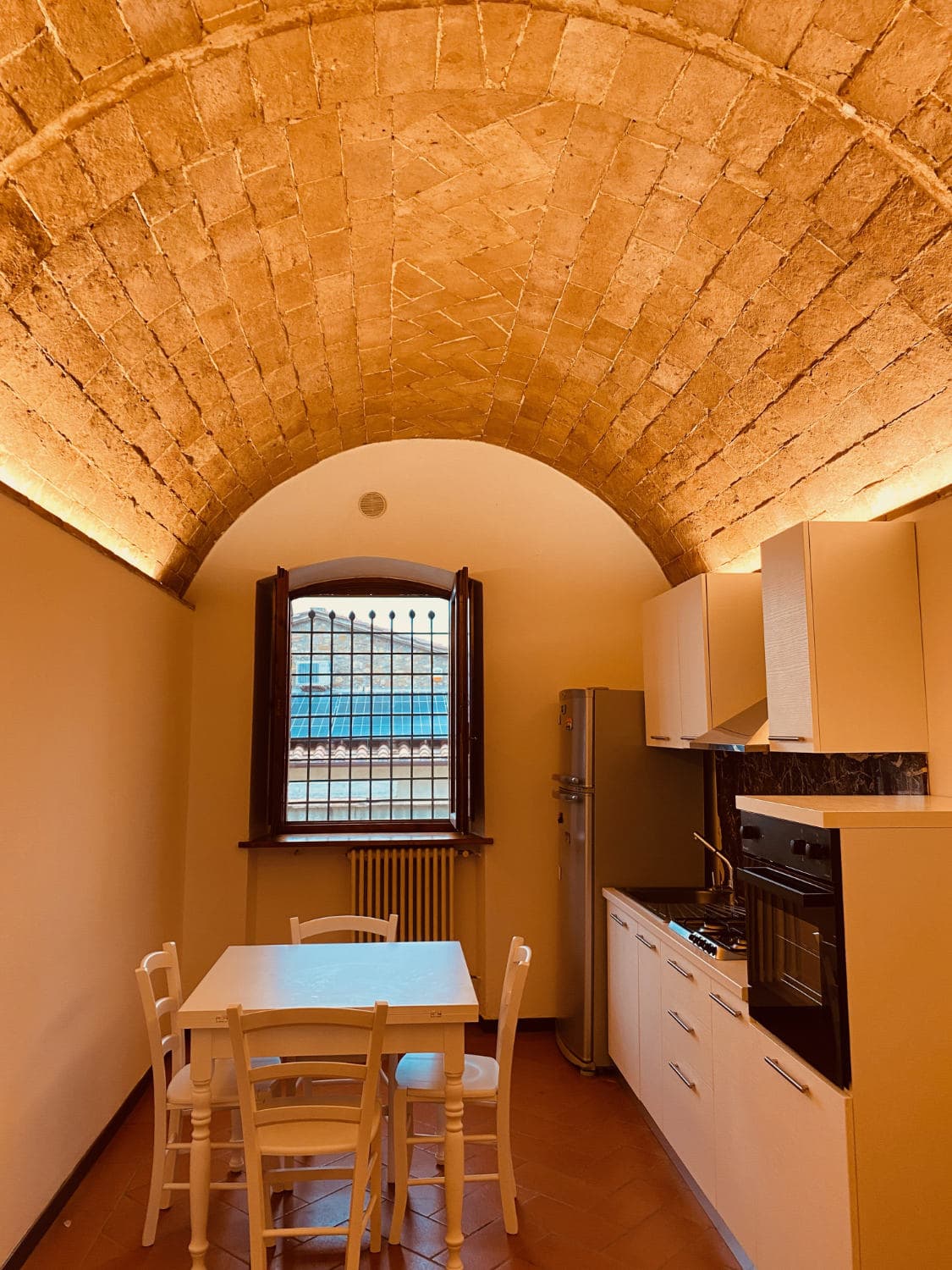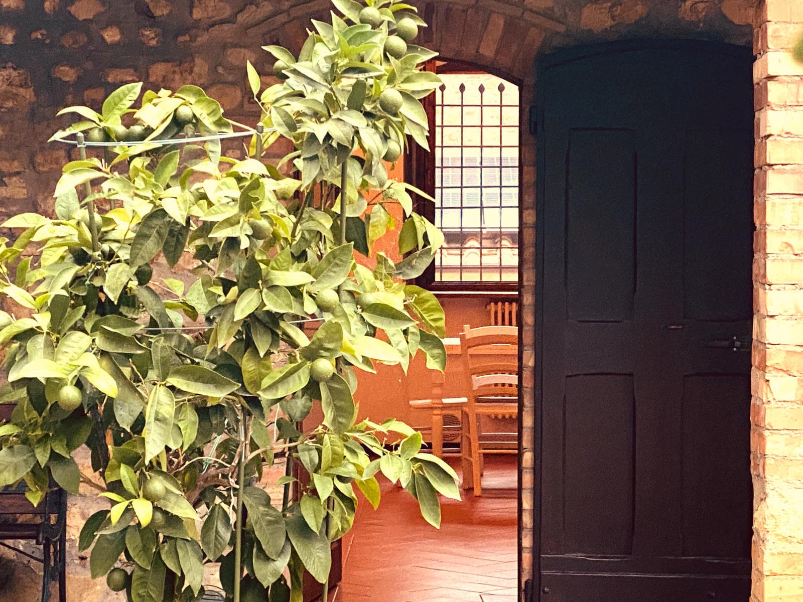 Mandorlo is on the ground floor of the main farmhouse, with a door opening onto the covered loggia and a further door opening out towards the last terrace and the swimming pool. You normally enter into the strikingly barrel-vaulted kitchen. Turning right will take you into a small lounge (or extra bedroom) which connects to the double bedroom with an ensuite shower room.