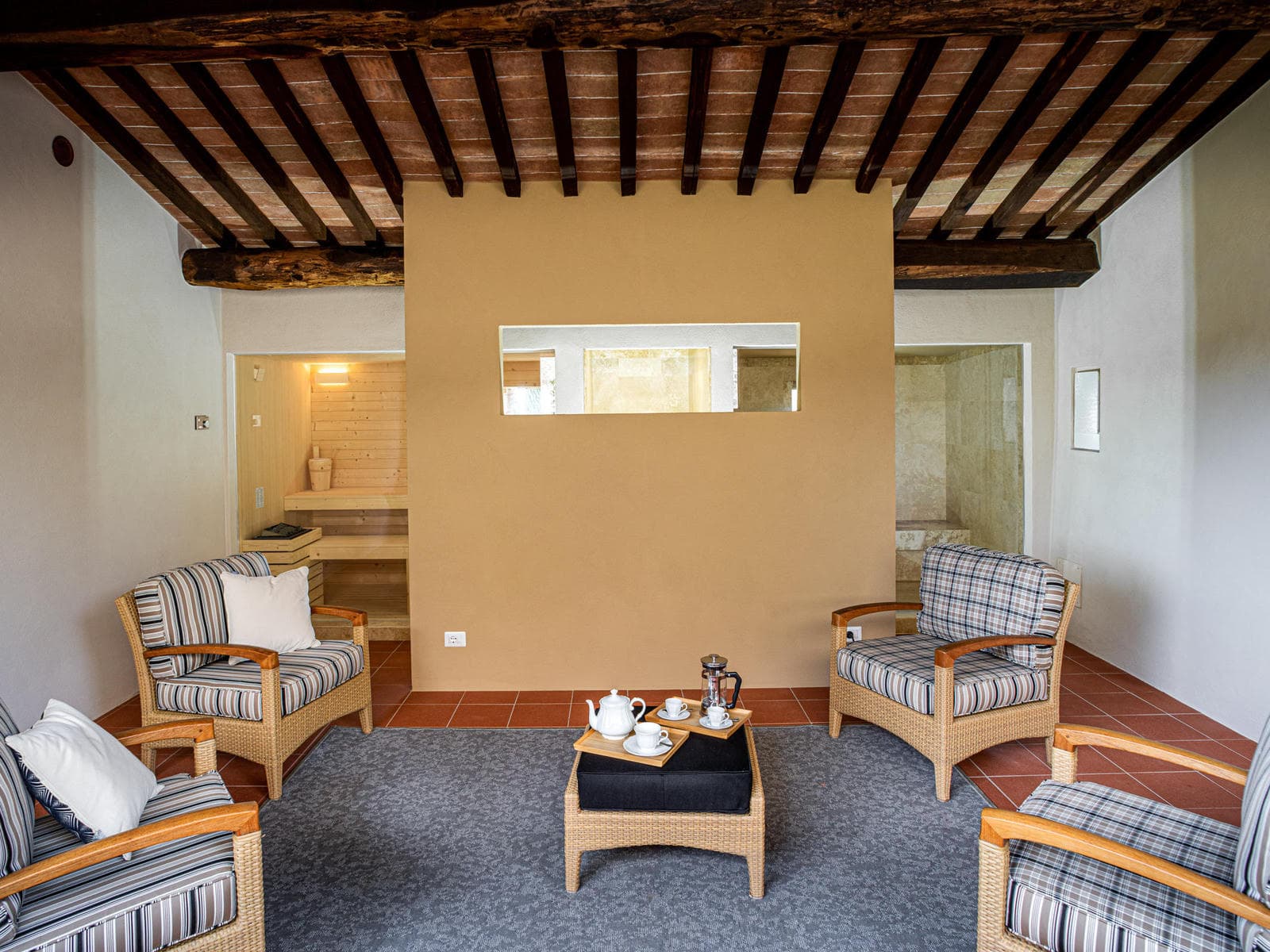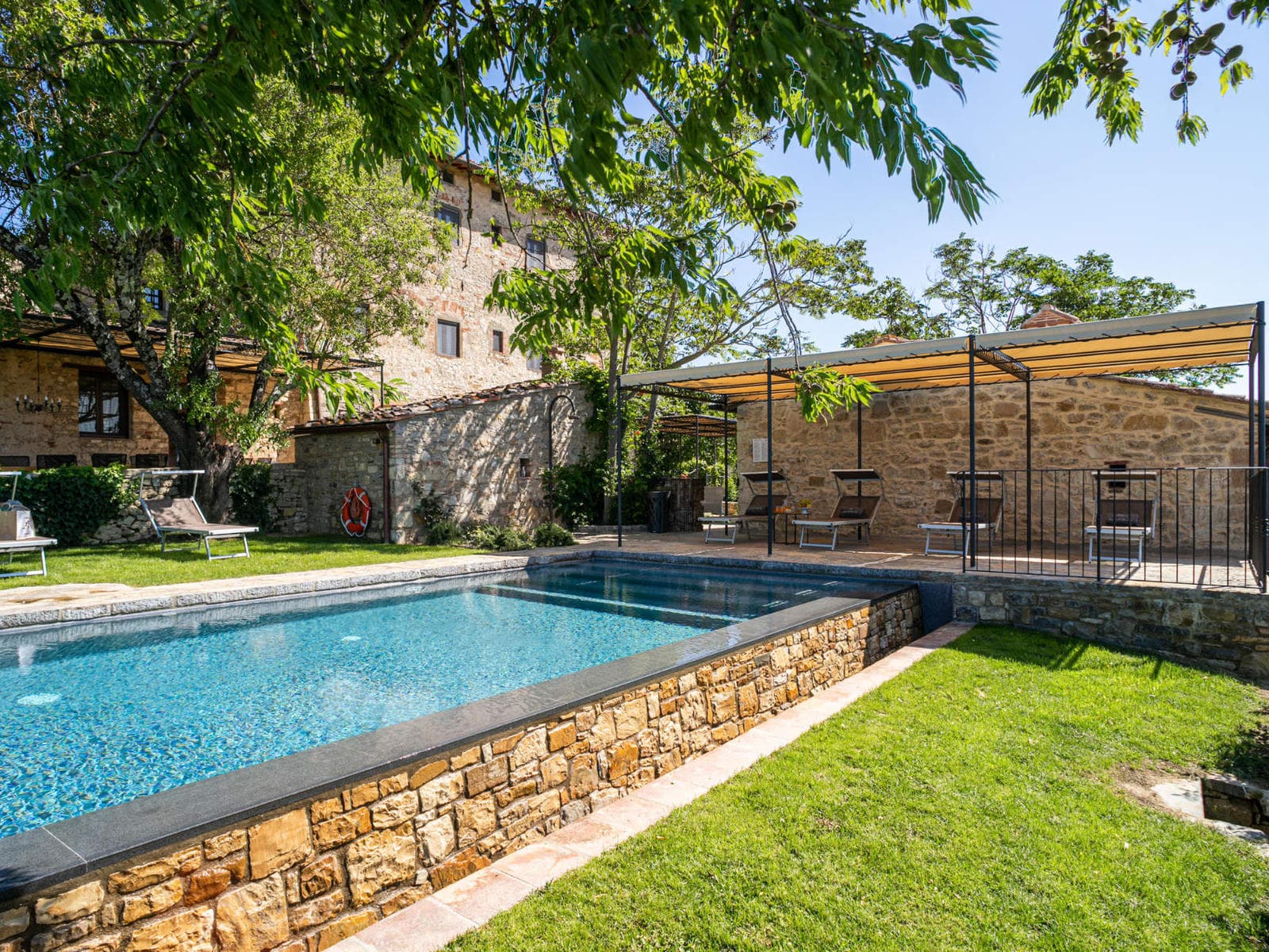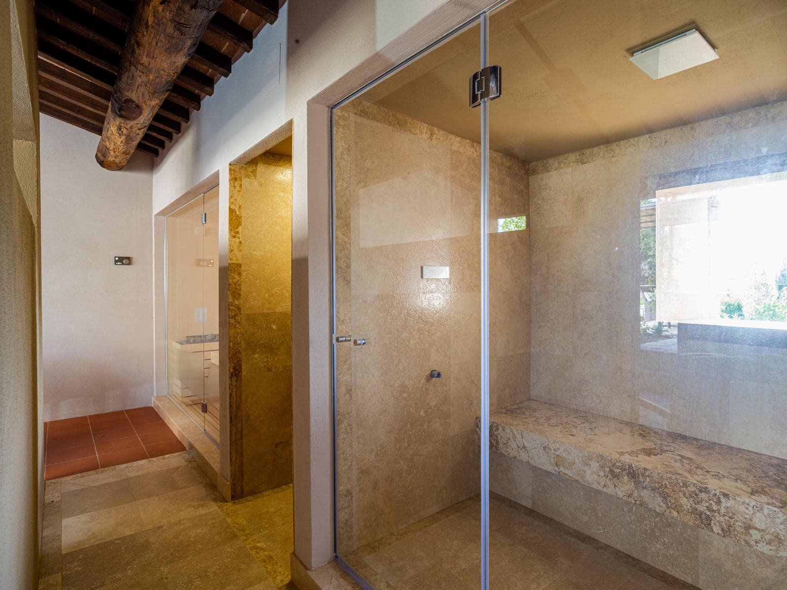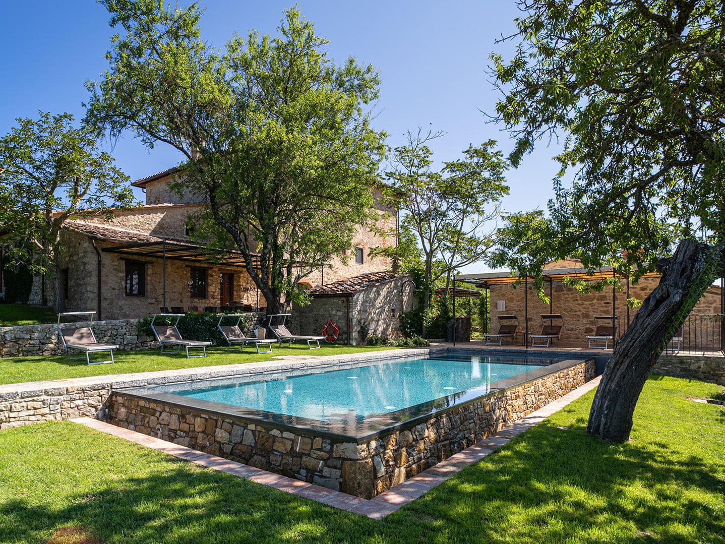 Outside by the pool a building houses a typical Tuscan pizza oven, as well as a sauna and a Turkish bath.