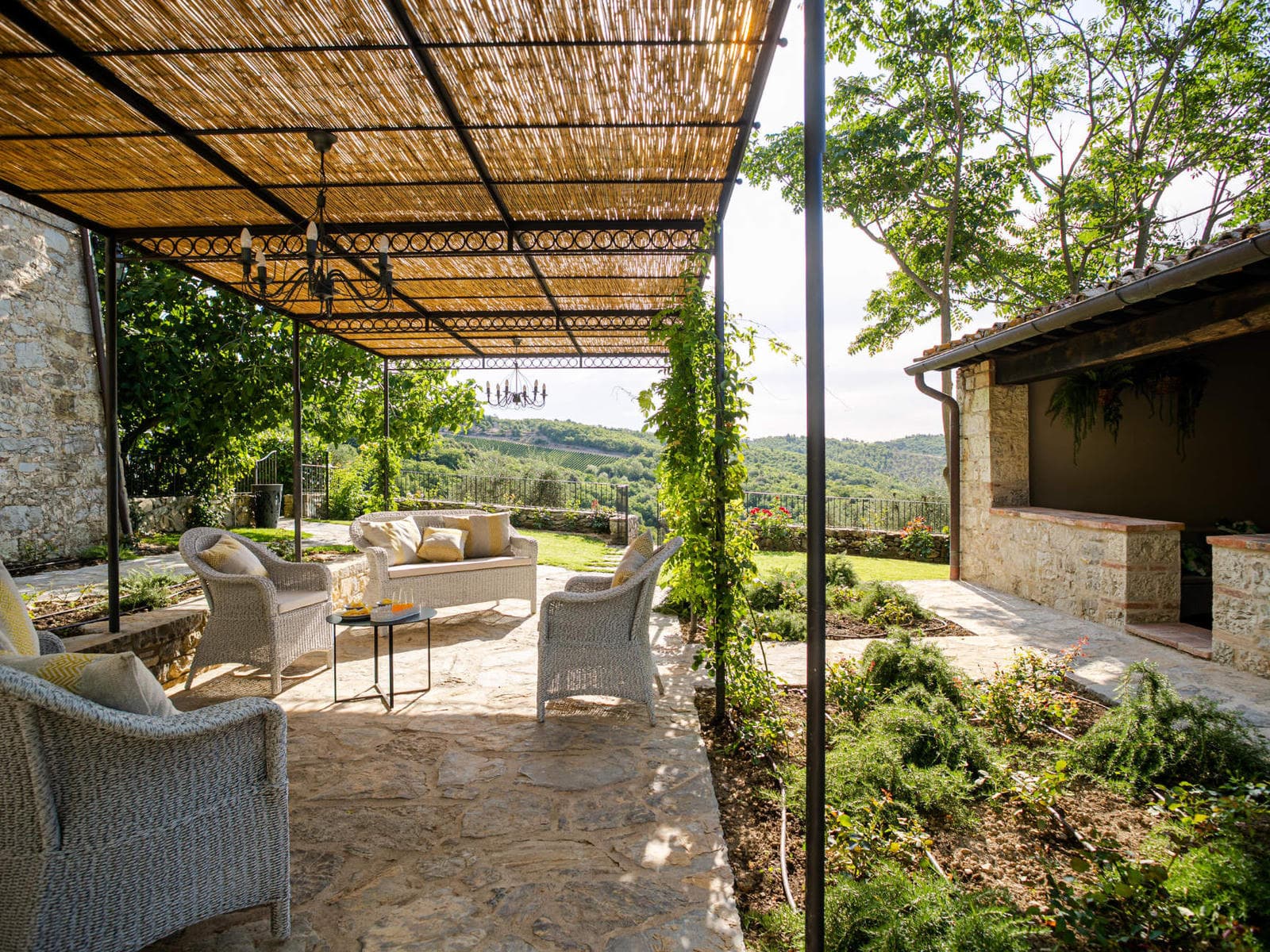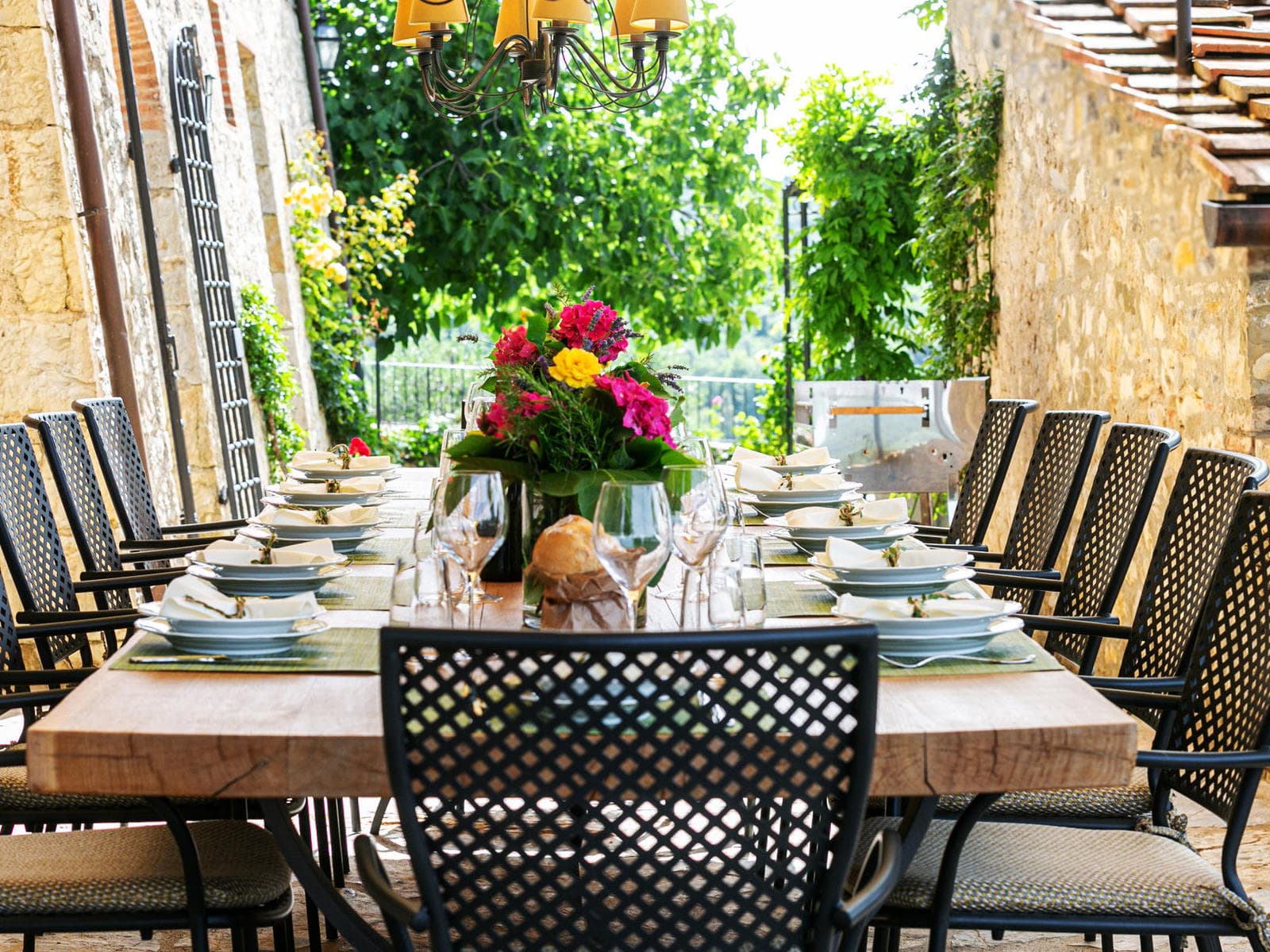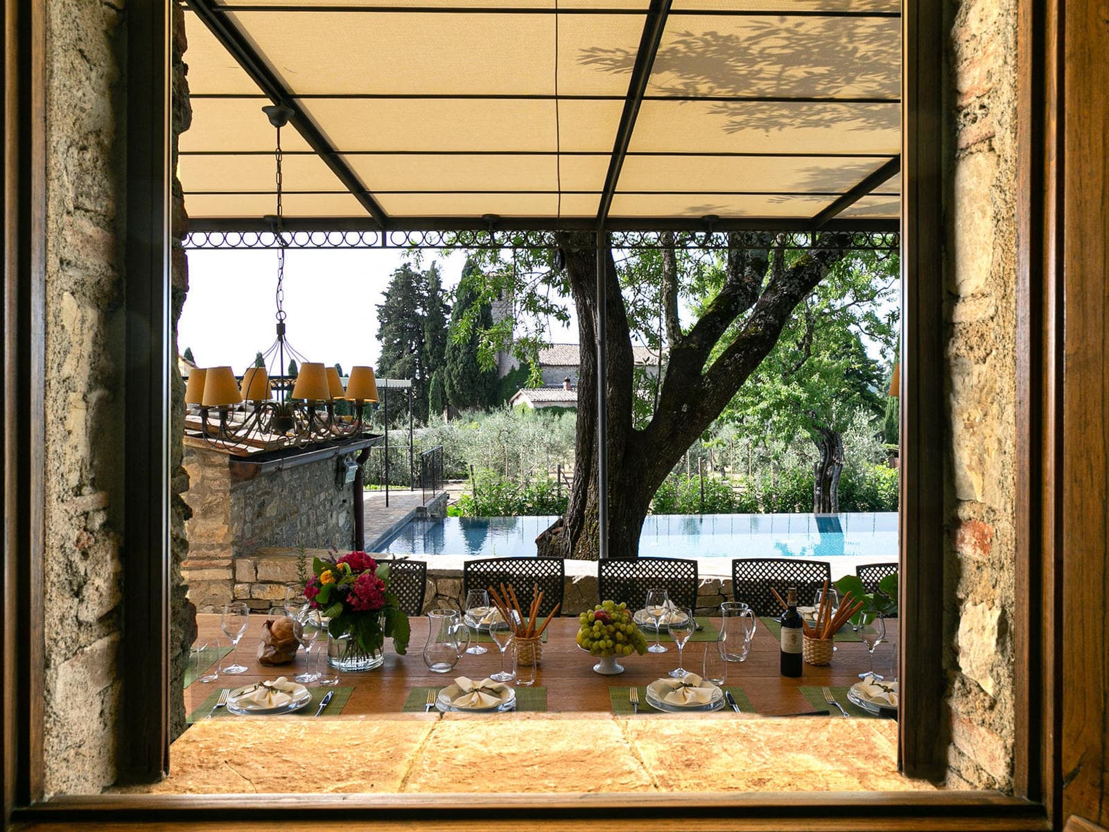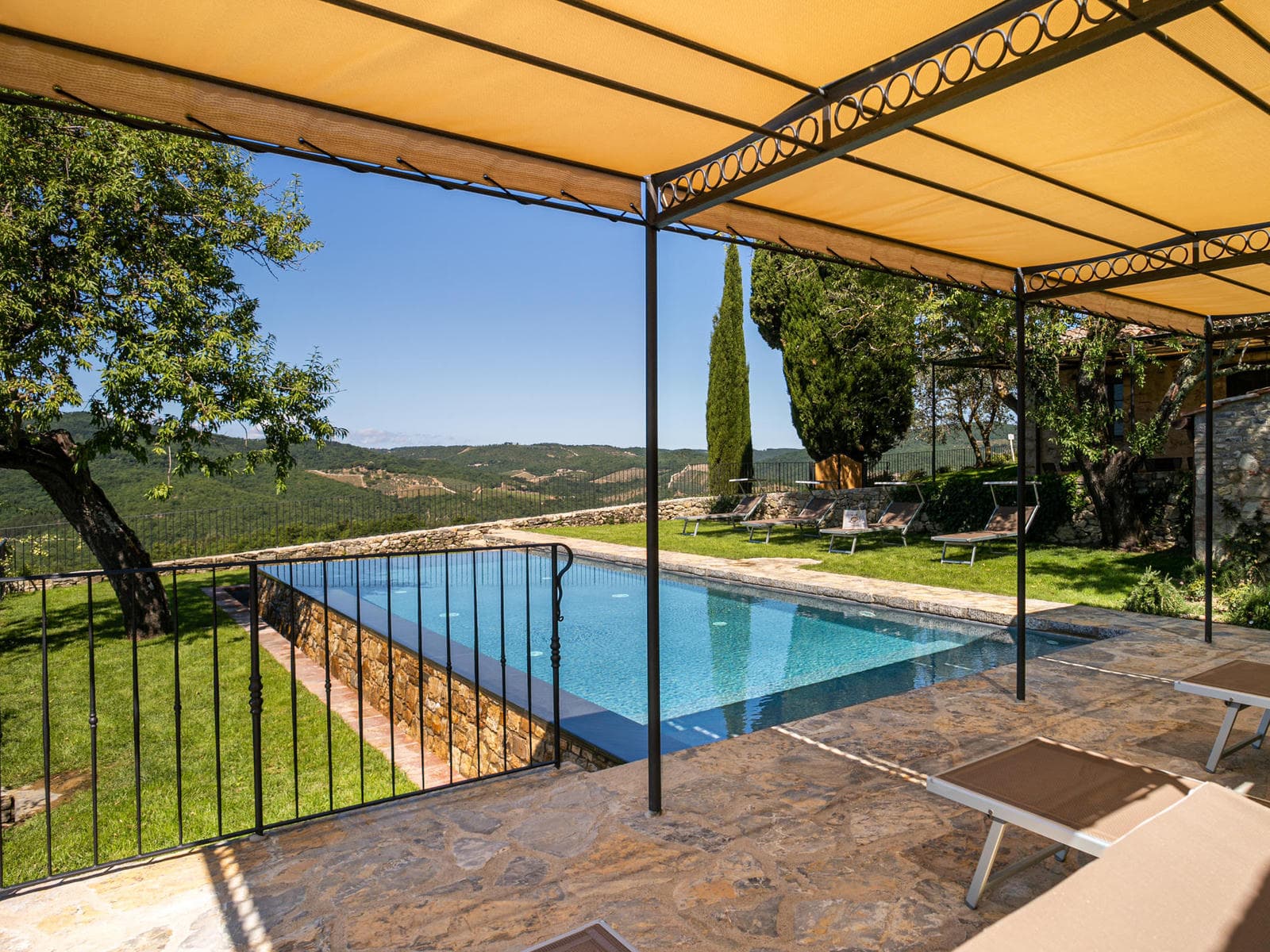 This ancient stone Tuscan house is set on a wide terrace with an infinity pool, facing a view of Chianti vineyards and a thousand-year old fortified church just below the house! The view is truly spectacular even for Tuscany which abounds with spectacular views.