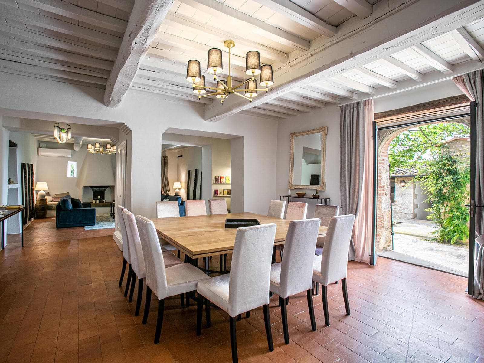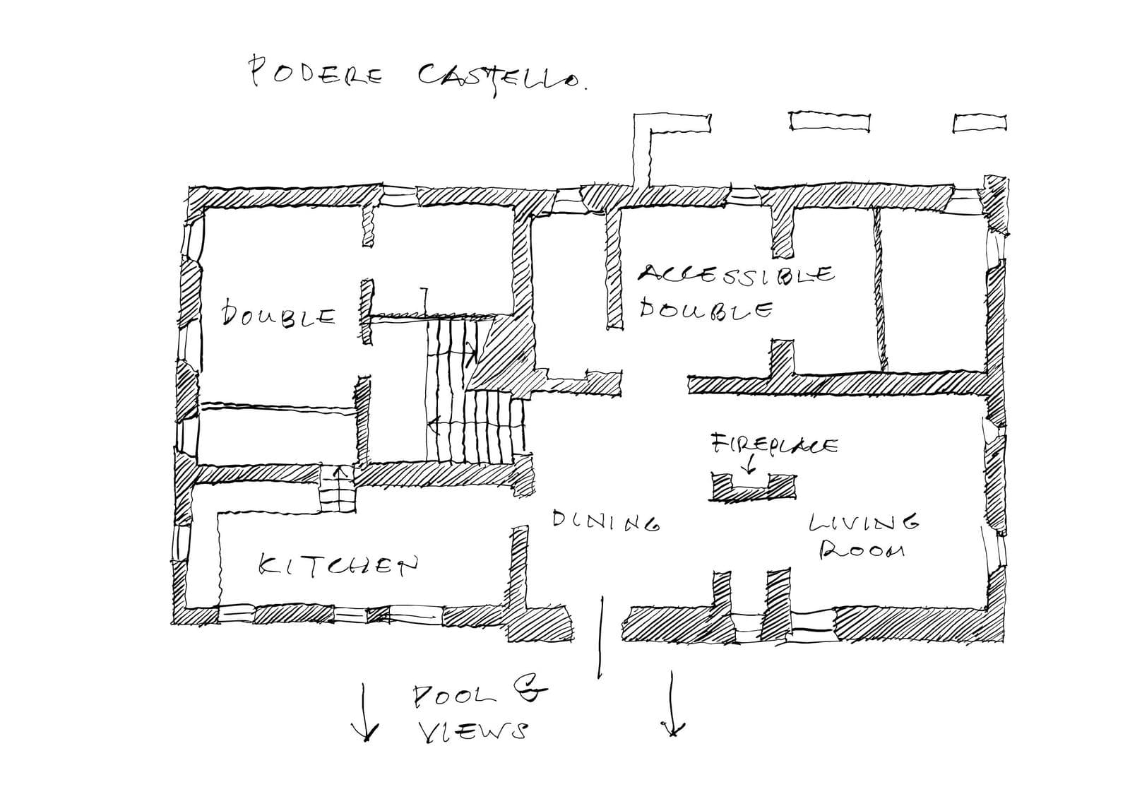 High in the forested hills of Chianti with sweeping views of vineyards, holm-oak woodlands and an 11th-century fortified church, Podere Castello offers luxury and serenity for up to fourteen guests. This elegant stone farmhouse has been beautifully restored with seven ensuite double bedrooms (plus an extra single adjoining the accessible bedroom for a carer), making it perfect for families, friends or multigenerational groups.