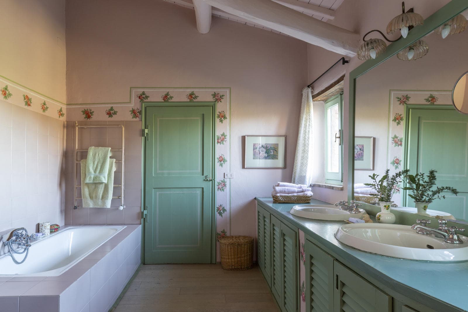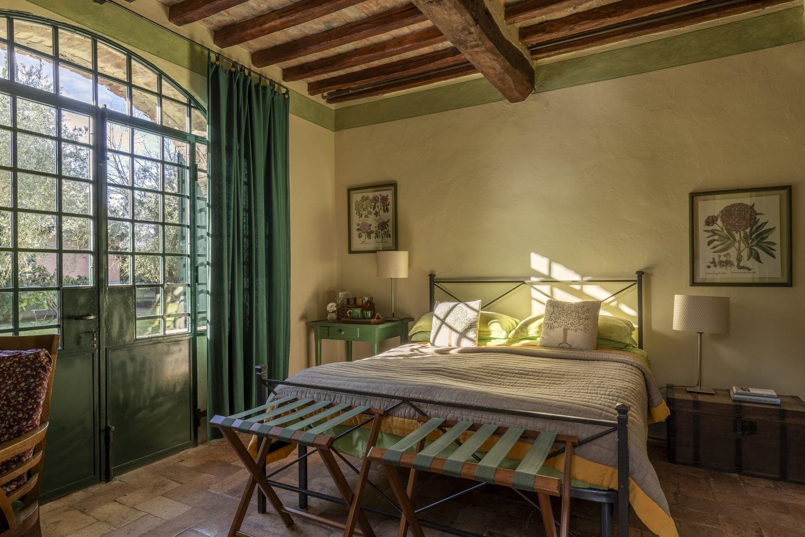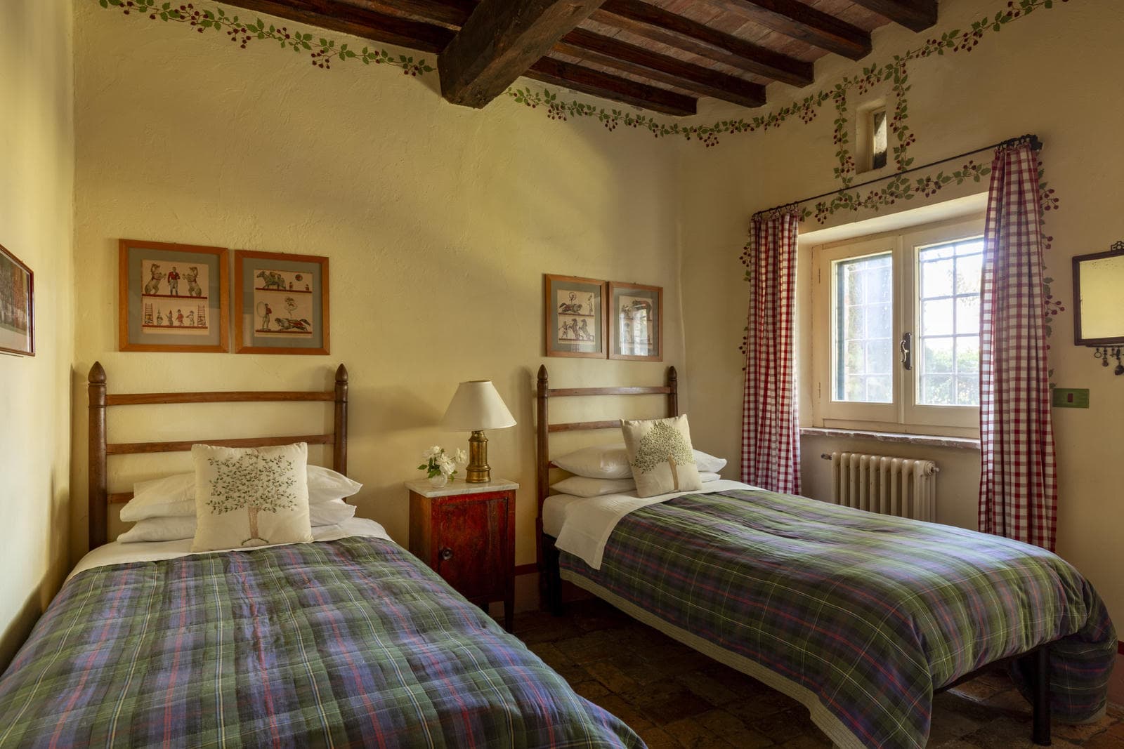 The ground floor of the main house has a large living room with an ancient Tuscan fireplace as its focus. By the living room you'll find a dining room that connects to the well-equipped kitchen. The kitchen also opens onto a shaded pergola perfect for al-fresco meals. On the ground floor you'll also find a double bedroom with ensuite bathroom and a twin bedroom, also ensuite.