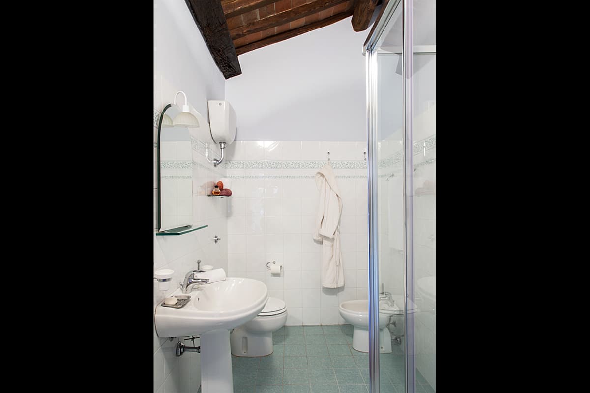 A long corridor leads up to two bedrooms, a double and a twin, which share a shower room. There is a covered parking area below Damiano, the house across the drive, and with their car safely stowed, guests will find it a short walk to the closest pool, the Family Pool, just at the top of the drive.