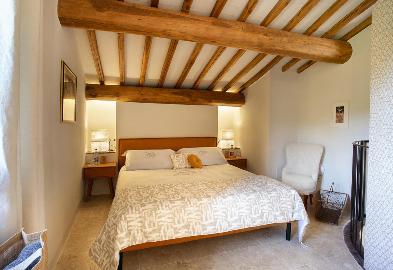 In the centre of the house an old stone column has been wrapped with a circular staircase, which takes you upstairs to a spacious double bedroom and an ensuite showerroom. A door from this upstairs bedroom opens onto the old threshing floor.
