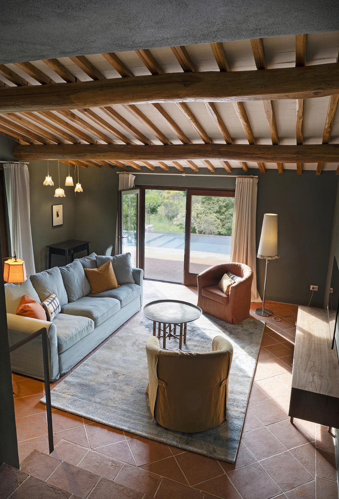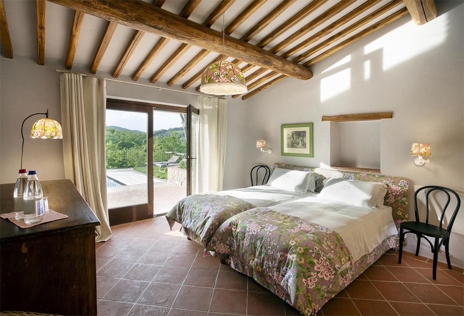 The villa's thoughtful layout works beautifully for a group of six: the main living area and two ensuite bedrooms occupy the ground floor, with easy access to the outdoor terraces and heated swimming pool, while a third ensuite bedroom sits privately above. The infinity-edge pool commands the same spectacular Chianti landscape views as the house itself - perfect for morning coffee or sunset aperitivos.