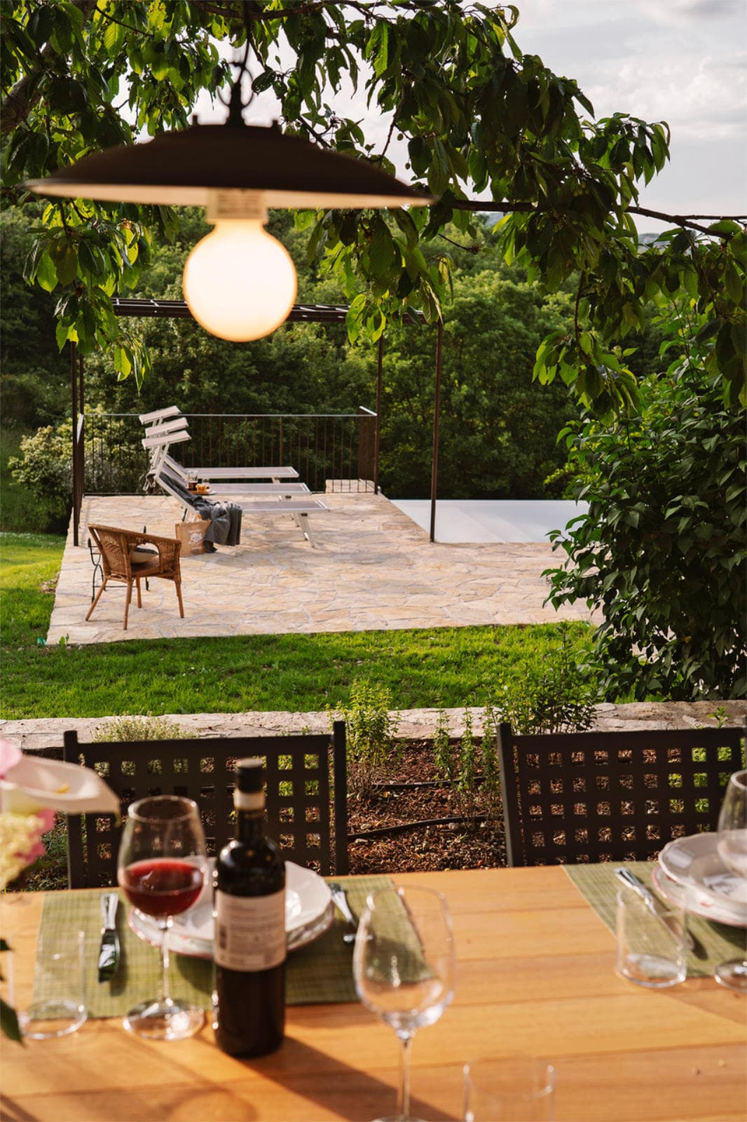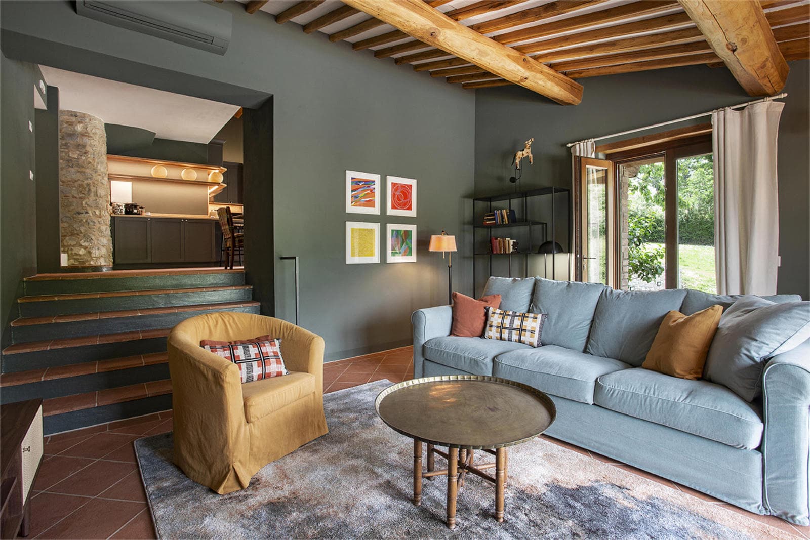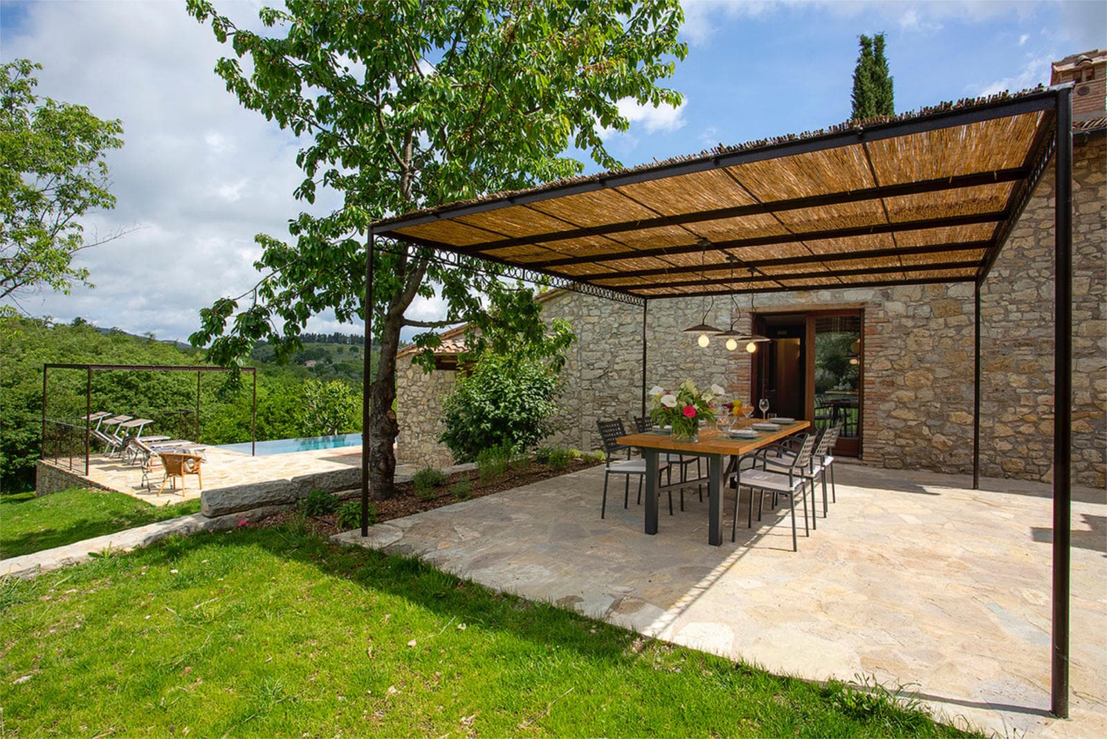 Starna is built into the side of the hills, with the living spaces on the lower floor. A living room has large windows opening out onto a terrace with a private pool. Behind the living room a few steps lead up to a well-equipped kitchen. French doors open onto a shaded pergola on a terrace, equipped for lovely al fresco dining.