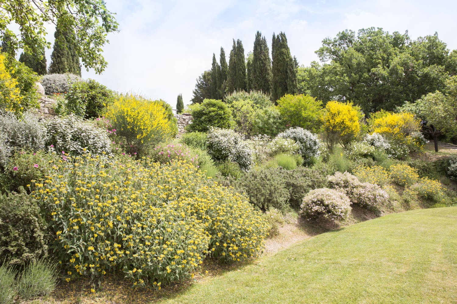 The gardens cascade down the hillside in terraces of roses, lavender and camellias among flowering trees and cypresses. The 12-metre pool sits framed in lawn on its own level, every lounger positioned to capture that remarkable view.