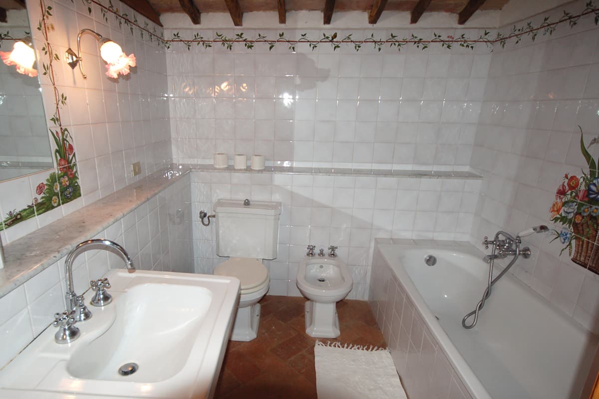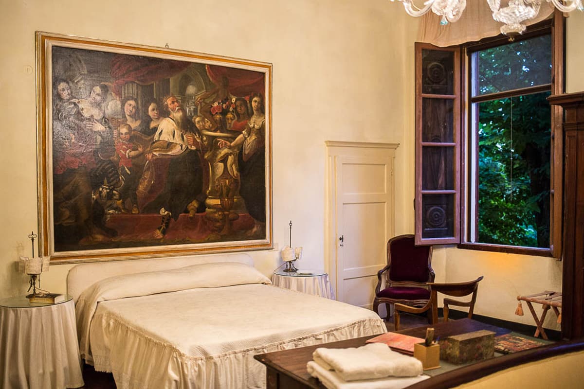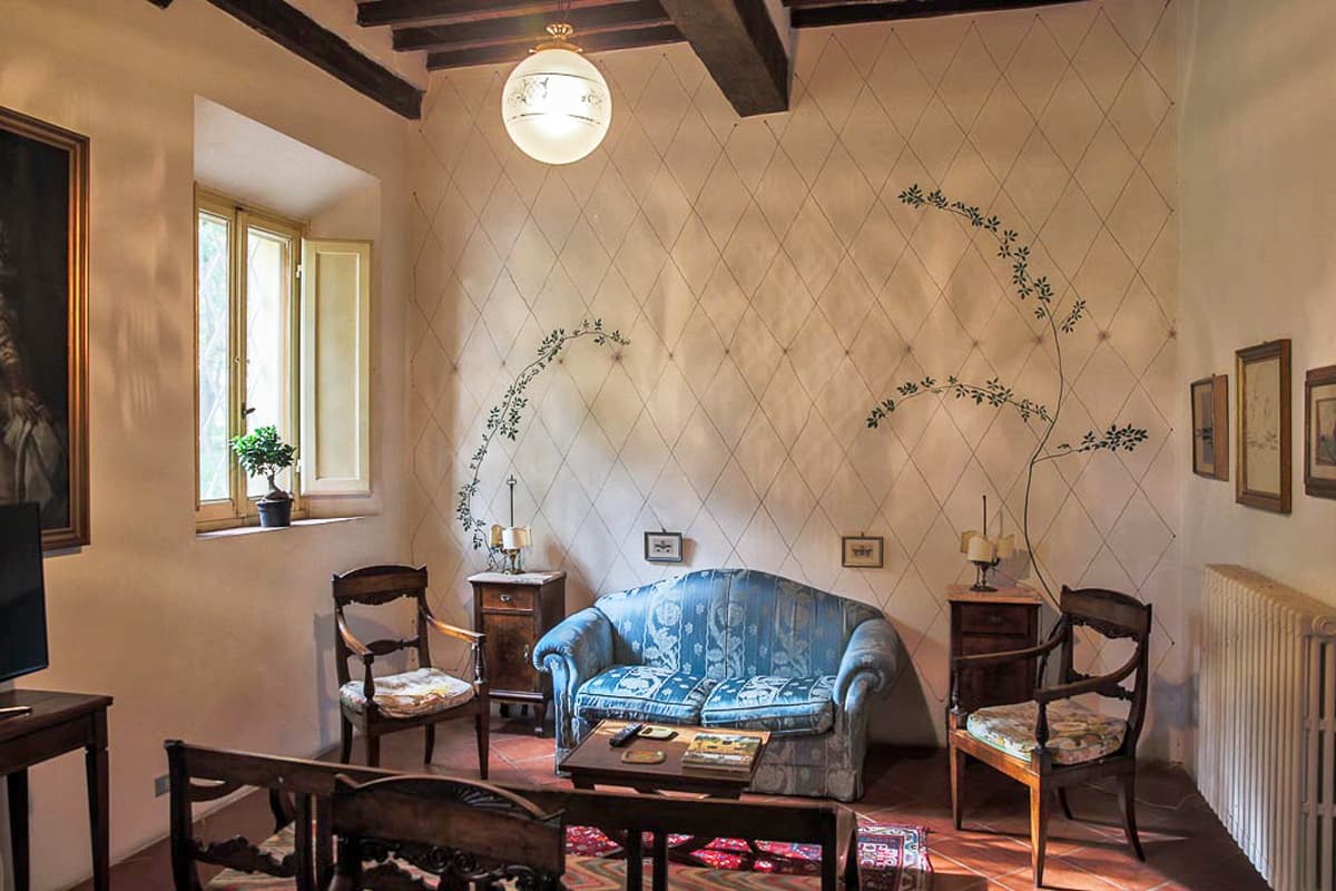 There is also an additional sitting room on the ground floor, and a shower room. From the front entrance there is access to the colonnaded courtyard of the villa, part of which may be used by guests, and which provides a delightful place for meals in spring and autumn. On the first floor, the former ballroom is now an enormous double bedroom with frescoed ceiling, tall windows, and a huge Murano chandelier. It has its own shower room. Another double bedroom, with its own bathroom, is frescoed by Dario Neri, a famous 20th century Sienese painter.