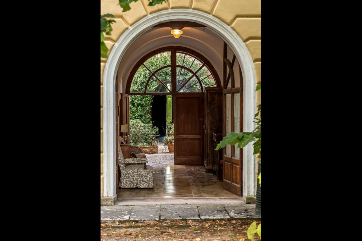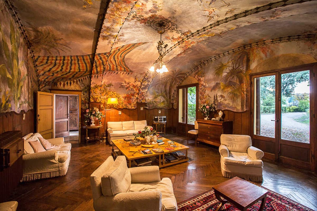 Also on the ground floor there is an elegant drawing room with a vaulted ceiling and walls entirely covered with "Trompe l'oeil" paintings of exotic flowers and plants, birds and oriental tents. French windows from this room open onto the parkland to the rear of the villa, which has rare trees, grottoes and remains of a 19th. C. aviary; the whole property is a delight, with panoramic views as far as Siena.