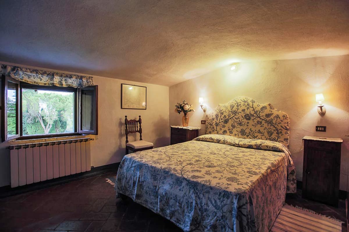The villa has luminous rooms recalling a splendid past, some with beautiful frescoes or wall paintings. There are formal gardens, with tall shady trees on one side, while at the front is a wide lawn with long box and laurel hedges on either side. Beyond these lawns, the large swimming pool has beautiful views through olive groves and gardens across to Siena and the rolling cornfields of the Crete. These views have been a continual source of inspiration for artists over the centuries, and they appear today much as they did when used as a backdrop by painters in the early renaissance; a number of versions of "Madonna with child" and the "Annunciation" are set in these rolling hills, standing in for Bethlehem.