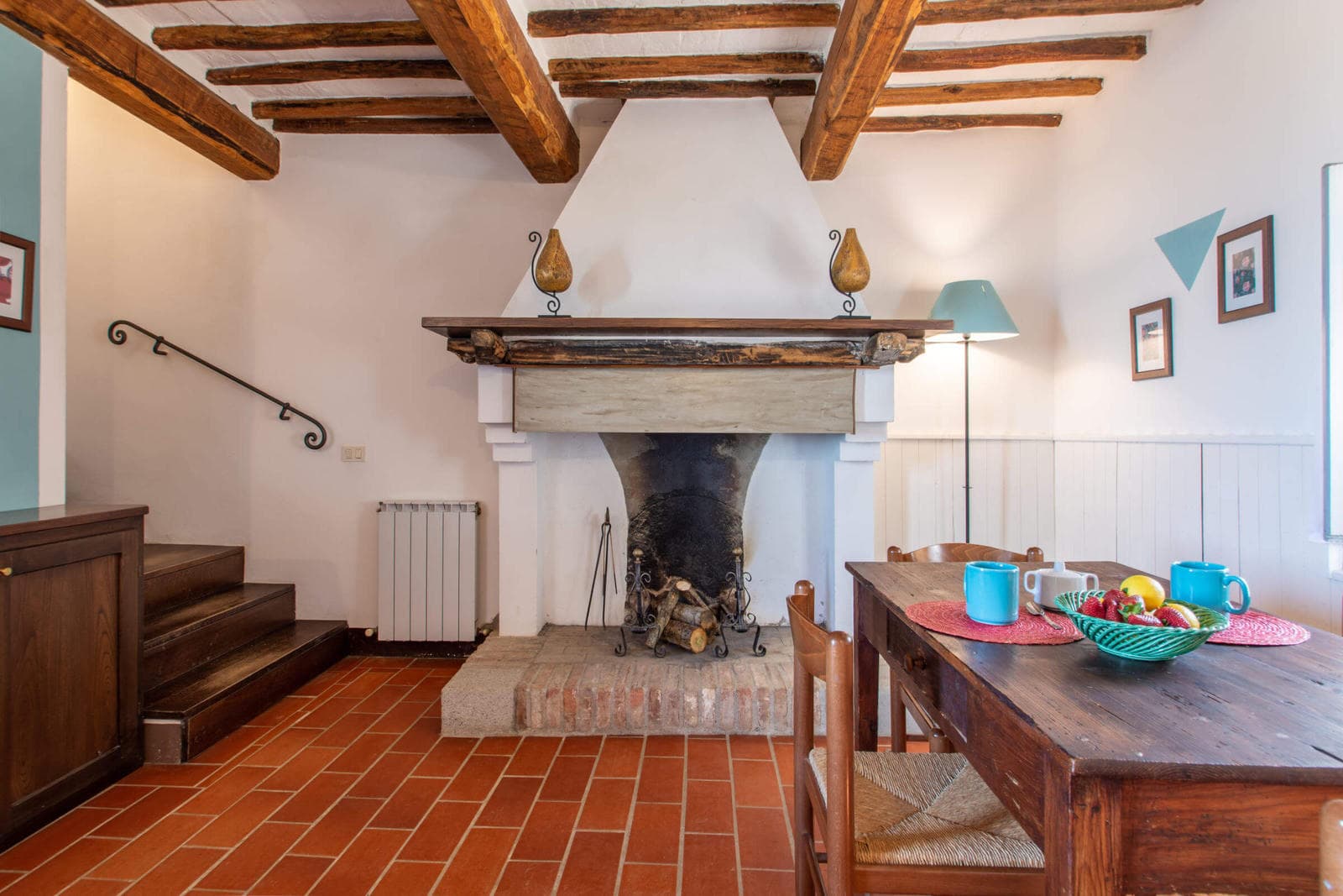 The entrance is straight into a living room with a fireplace, a galley kitchen is tucked under the stairs and has a window with views out over towards Lake Trasimeno. A staircase leads up to the upper floor where you'll find a double bedroom and a twin which both share a bathroom.