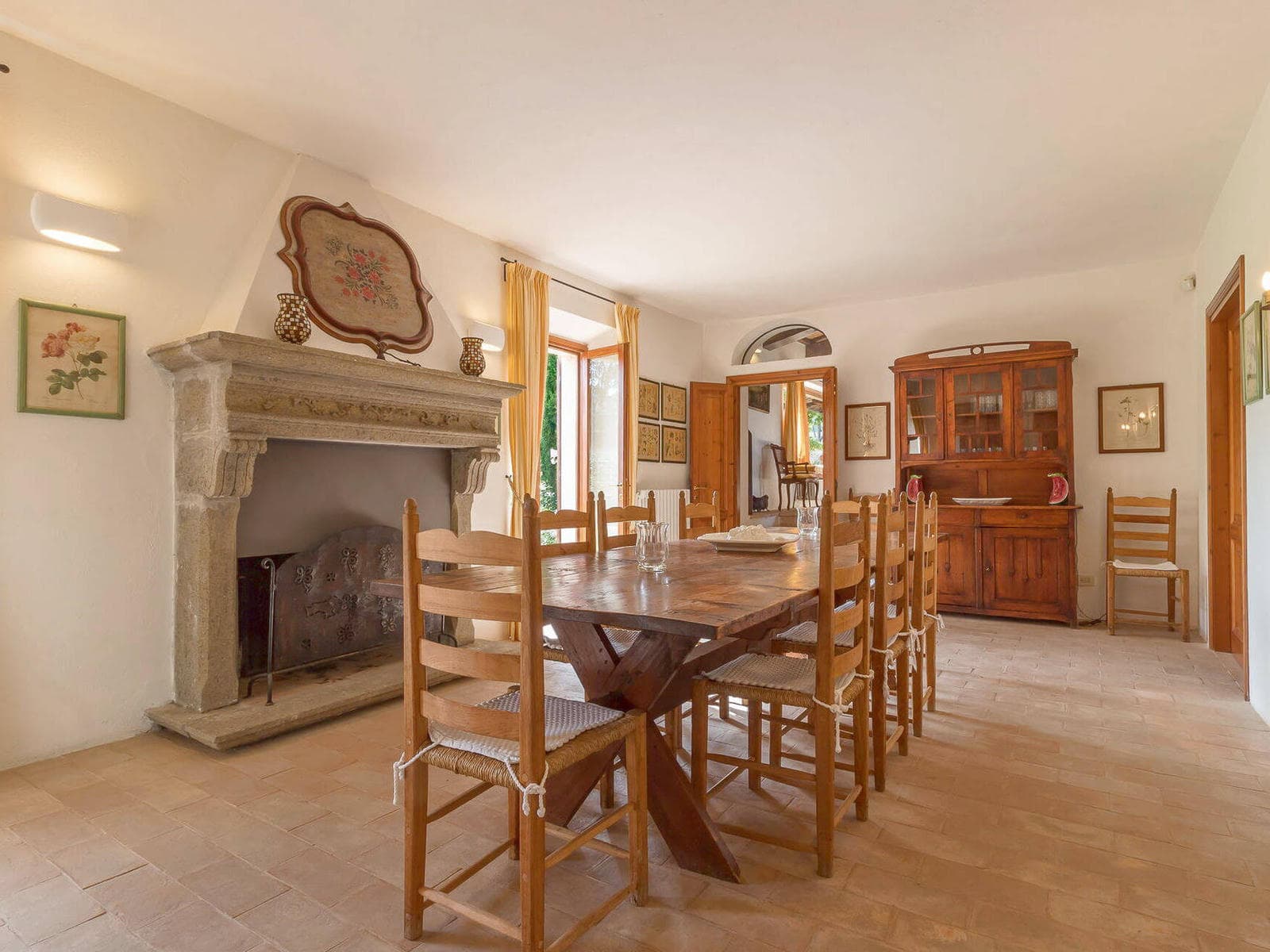 On the ground floor, guests are greeted by an entrance leading into a first living room, adorned with a Chesterfield couch and a couple of armchairs accommodating up to seven people. Adjacent to this is another spacious living room boasting a working fireplace and ample seating for twelve individuals. Double doors open onto a covered loggia, while next to the living room lies a generously sized dining room with a functioning fireplace, capable of hosting up to 14 guests.